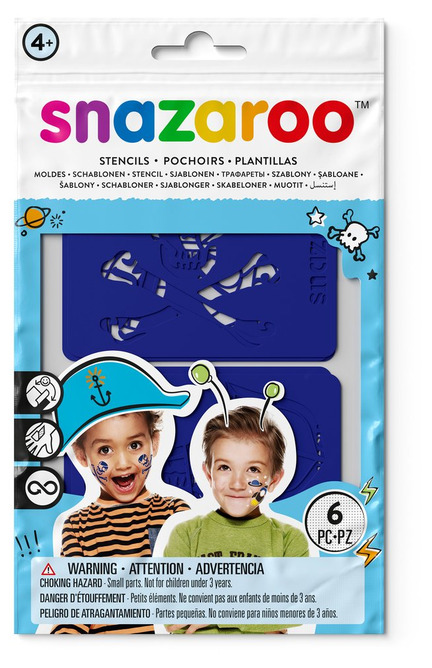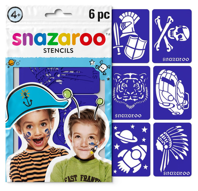 Innehåller sex olika schabloner, lätt att använda och säkra för barn. Självhäftande baksida håller schabloner på plats för att få bra resultat. Böjbara för att passa bra till ansikte, armar och händer. Återanvändbara och tvättbara.