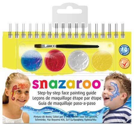 Förpackningens framsida har också märkets namn, Snazaroo, skrivet i djärva, lekfulla bokstäver som varierar i färg. Detta namn är centralt placerat och lättläst, vilket stärker produktens igenkänning. Under namnet står en uppmaning för steg-för-steg ansiktsmålning, vilket antyder att produkten inte bara är rik på färg utan även på vägledning, något som underlättar för både barn och vuxna.
