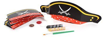 På bilden syns ett färgglatt och lekfullt kalas-kit från Köpstaden.se, märkt med varumärket Snazaroo, designat för att förvandla en vanlig tillställning till ett spännande piratäventyr. Det centrala i motivet är ett set med klassiska pirathattar tillverkade i kartong, prydda med välkända symboler som korslagda svärd och dekorativa element i svart och guld, vilket bidrar till en autentisk piratkänsla.