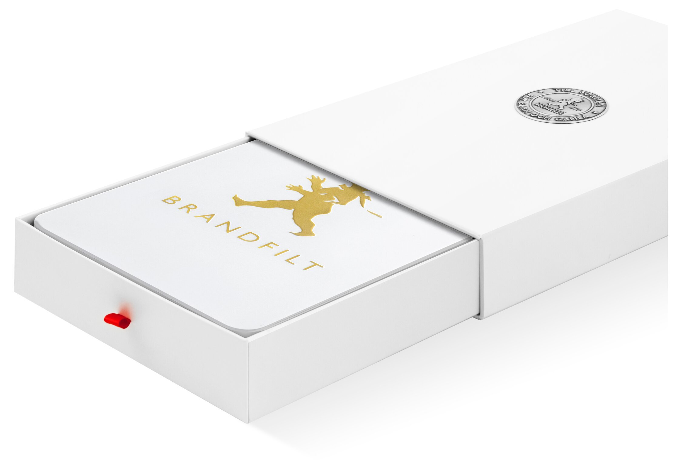 Bilden från Köpstaden.se visar en brandfilt från Solstickan, som präglas av diskreta och stilrena detaljer. Den vita kartongen har en rektangulär form och är försedd med en diskret dragflik i en ljusröd nyans. På framsidan av kartongen syns en tydligt tryckt logotyp i silverfärg, vilket ger en känsla av autenticitet och kvalitet.