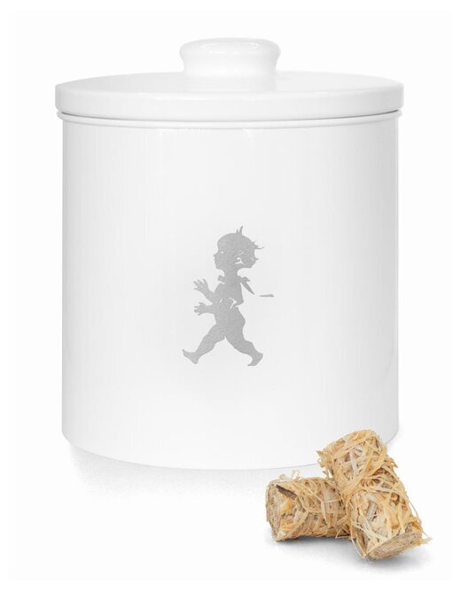 Stilren plåtburk till förvaring av braständare, med motiv av den klassiska Solstickepojken. Plåtburkens lock sluter tätt & håller dess innehåll fritt från fukt. Braständare träull medföljer ej men kan köpas separat.