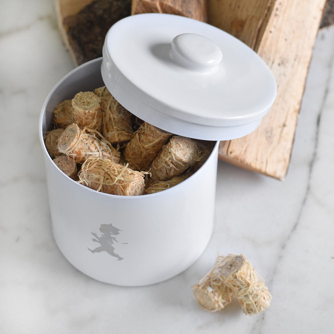 Förvaringsburken innehåller braständare i form av träull, vars naturliga och robusta textur skapar en intressant kontrast mot burkens rena yta. Träullen är lindad och formad till mindre rullar som ligger tätt packade i burken. Ett par av dessa rullar föreställer sig precis utanför burken, vilket ger intryck av att vara redo för användning. De ljusa, naturfärgade tonerna av träullen framhäver dess organiska struktur, vilket ger en tydlig visuell koppling till naturen.