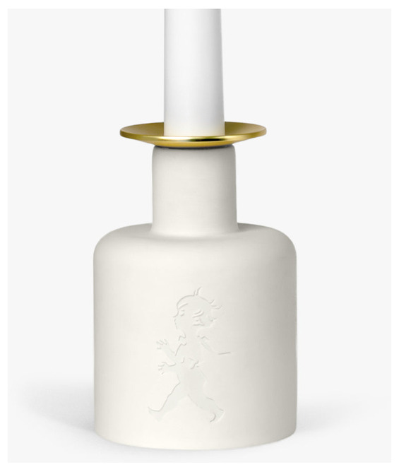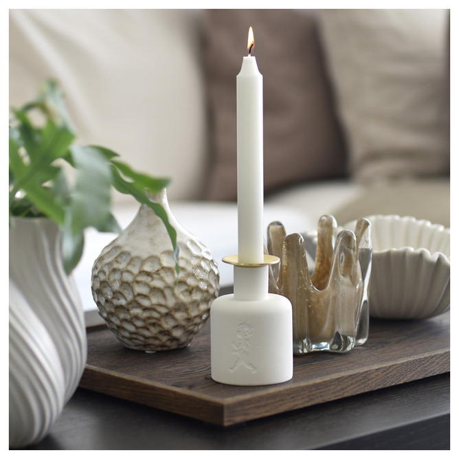En elegant ljusstake i keramik som på ett harmoniskt sätt förenar form och funktion. Den medföljande ljusmanschetten i guld skyddar underlaget från stearin och ger samtidigt ett sofistikerat intryck. En tidlös inredningsdetalj som passar lika bra i vardagens lugn som till festdukningen.
