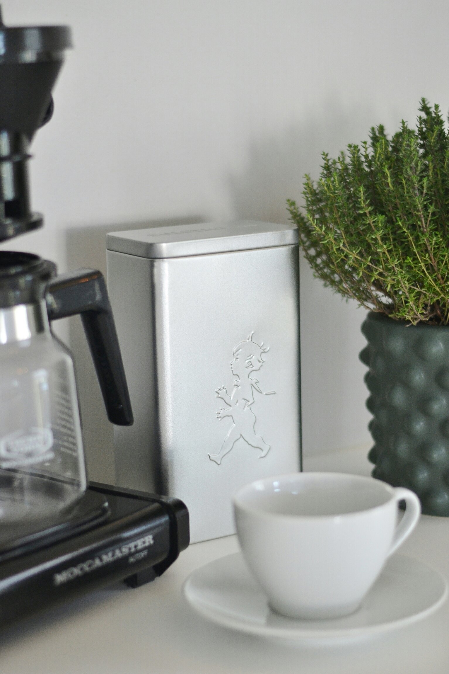 Snygg plåtburk med motiv av den välkända solstickepojken på både fram & baksida. Passar de allra vanligaste standardförpackningar av kaffe. Mått: 20,5 x 10,3 x 7,2 cm