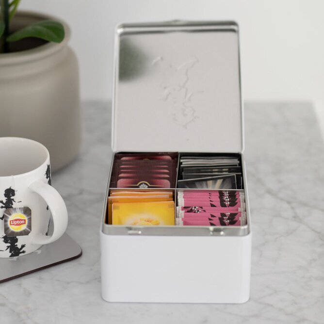 Bilden visar en elegant och funktionell förvaringslösning från Solstickan, tillgänglig hos Köpstaden.se. Den vita plåtburken med fyra fack är designad för att organisera tepåsar på ett effektivt sätt. Burken är rektangulär med ett lock som är lyft för att avslöja dess innehåll. Locket har en subtil, smakfull design ingraverad på insidan, vilket tillför en stilren känsla utan att vara överväldigande.