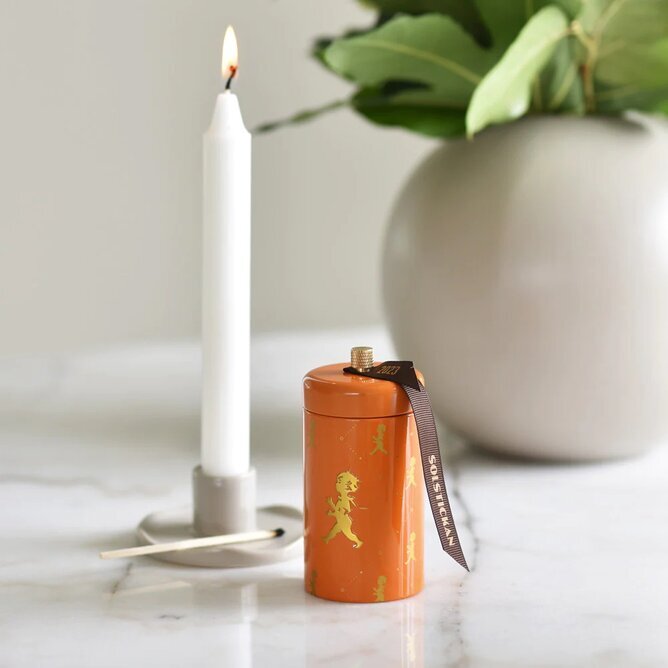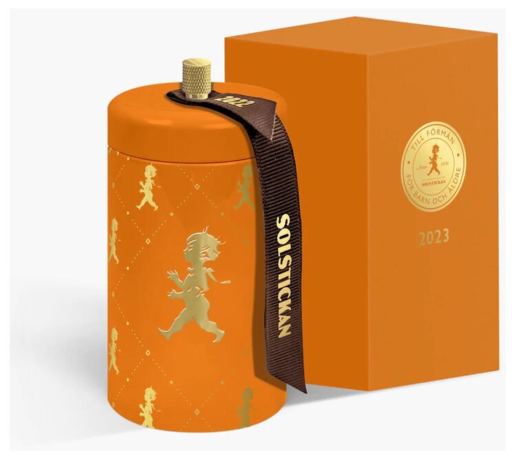 Stilren plåtburk med motiv av den klassiska Solstickepojken, Plåtburken innehåller 100 stycken extra långa tändstickor som tillverkats i asp från de svenska skogarna. Plåtburken har på sin undersida ett utbytbart plån. En uppskattad present både att ge & få.