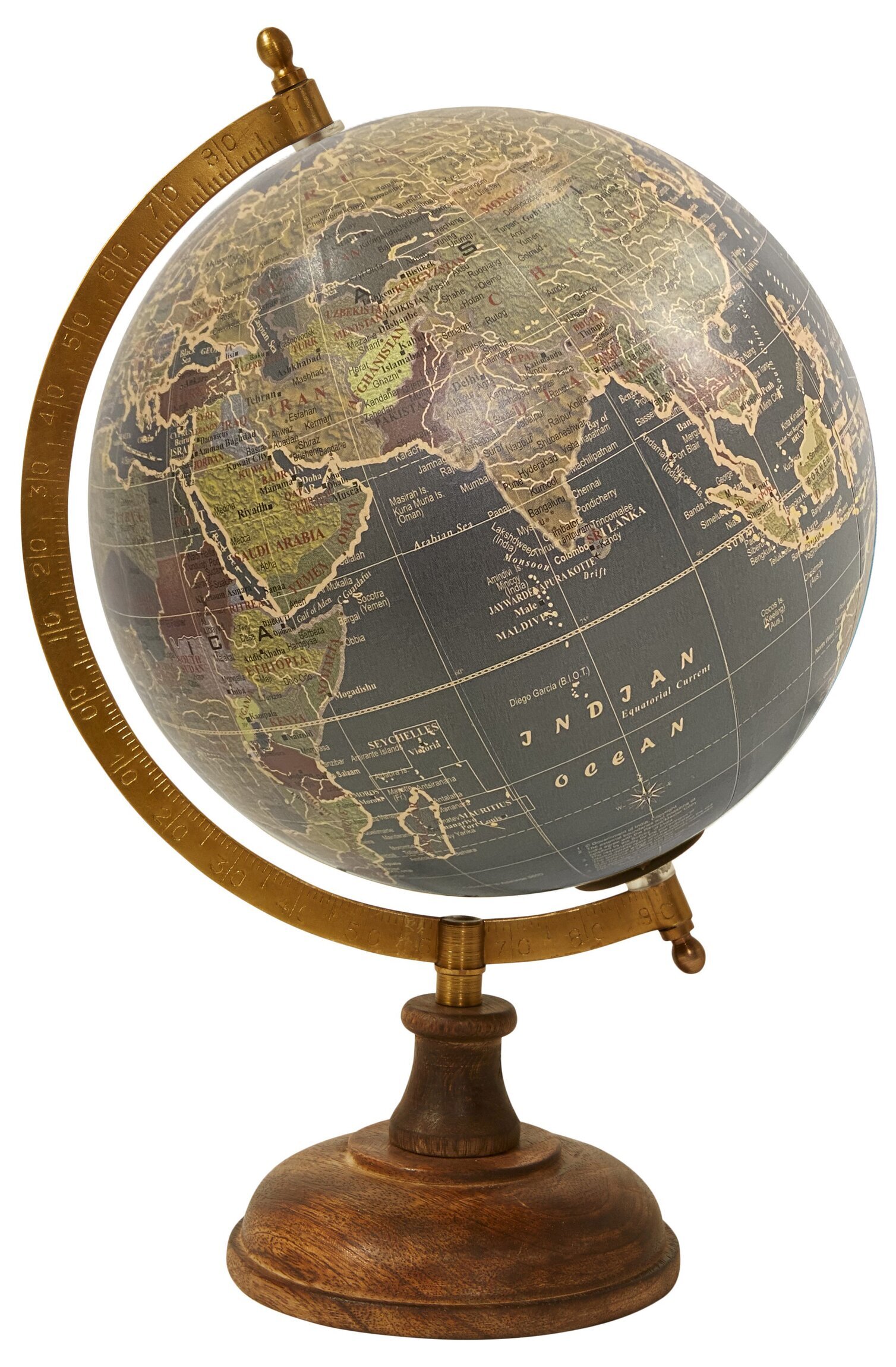 Globens yta hålls uppe av en halvcirkel-formad meridian, i en mässingsliknande ton, som sveper runt och ger både elegans och stabilitet. Markeringarna på meridianen är subtila men läsbara, vilket gör det enkelt att notera latitud och longitud. Detta erbjuder både en dekorativ och en funktionell upplevelse av kartläsning.