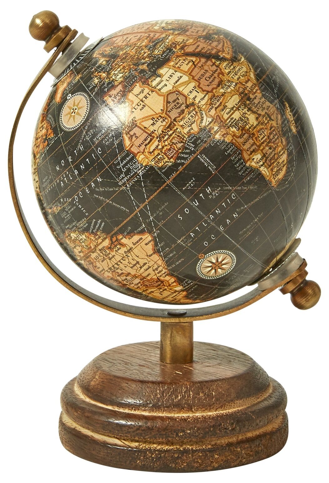 Själva globen har en mattsvart bakgrund som komplementeras av kartans färger i jordnära toner av beige, brunt och dämpad orange. Kontinenterna och ländernas konturer är tydligt markerade, vilket gör det lätt att se olika geografiska områden. Hav och oceandområden är presenterade med tydliga linjer som markerar latitud och longitud, vilket ger den ett traditionellt och informativt intryck.