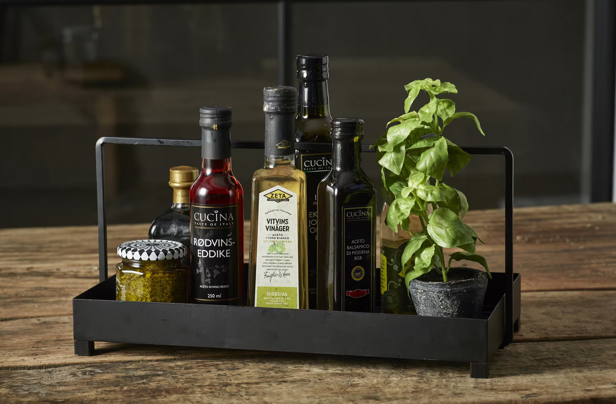 Innehållet i brickan inkluderar en rad olika flaskor med vinäger och olja samt en burk med pesto. Flaskorna har eleganta etiketter i varierande färger som rött, vitt och guld, vilket ger ett livfullt och inbjudande intryck. Bredvid flaskorna står en liten kruka med en frodig basilika, vars gröna blad skapar en fräsch kontrast mot de mörkare tonerna i brickan.