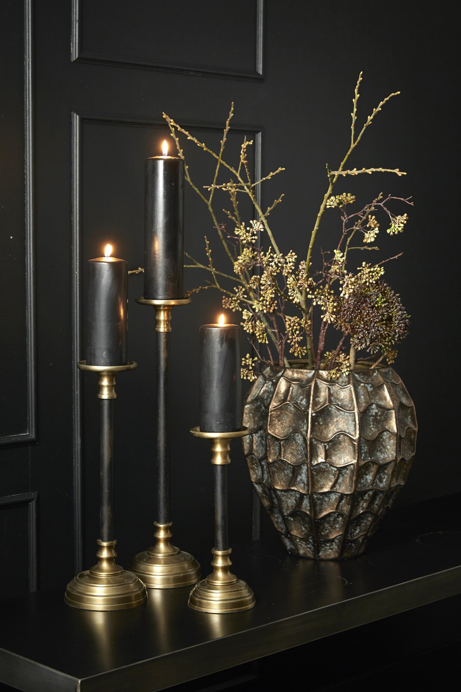 Bilden från Köpstaden.se visar en elegant uppsättning inredningsobjekt som inkluderar ljusstaken Guld/Svart från Speedtsberg. Fokus ligger på tre stilfulla ljusstakar i varierande höjd, som alla bär mörka, tända stearinljus. Ljusstakarnas design kombinerar en slank svart bas med glänsande guldfärgade detaljer på fot och ljushållare, vilket skapar en harmonisk balans mellan färg och material.