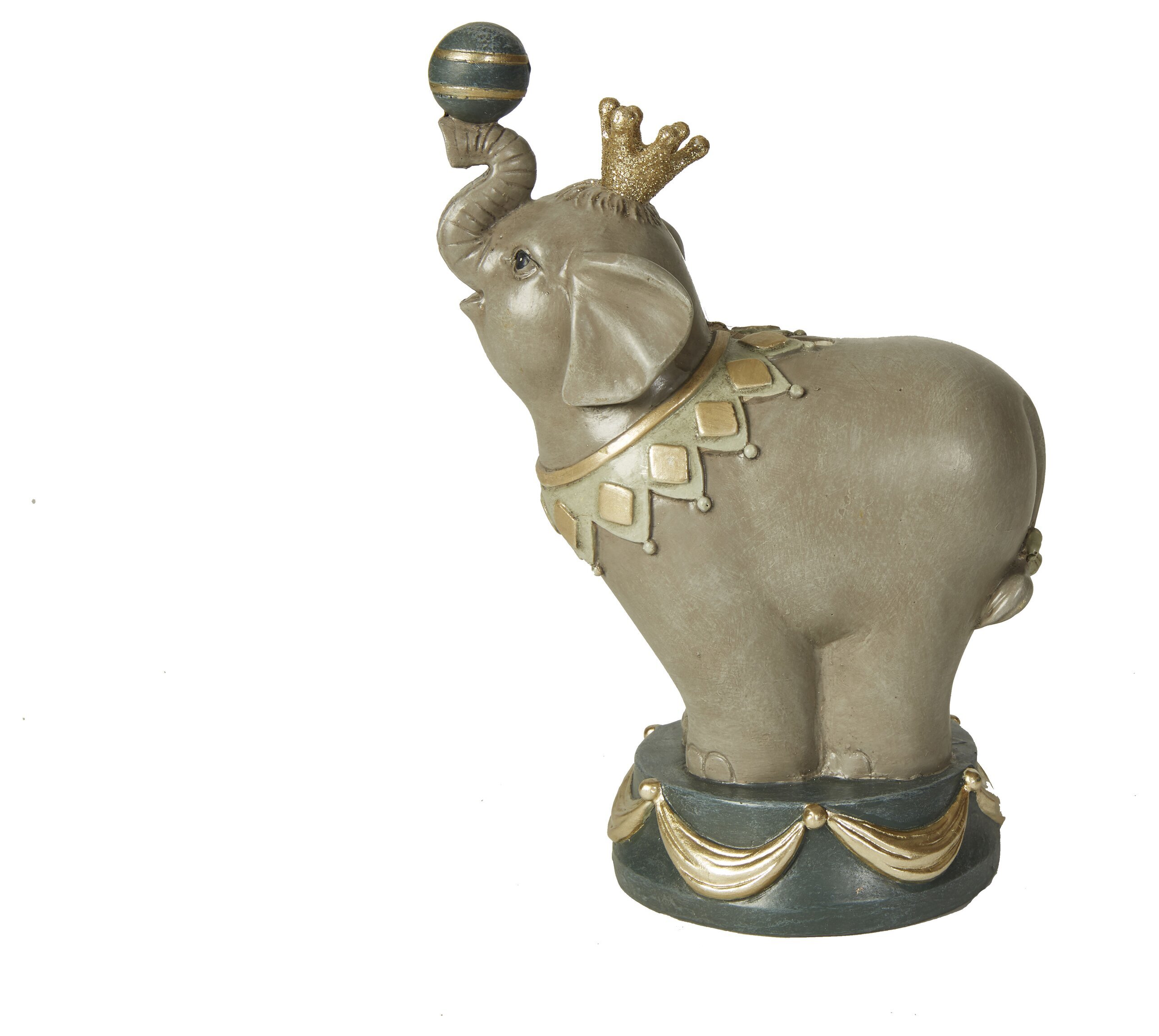 Elefantens snabel är elegant upplyft, och i den balanseras en liten boll. Bollen är noggrant målad med horisontella ränder i guld och mörkblått, vilket ger en lekfull touch till den annars stilrena figuren. Den gråa färgen på elefanten är neutral och mjuk, vilket gör att sparbössan passar in i både moderna och klassiska inredningsmiljöer.