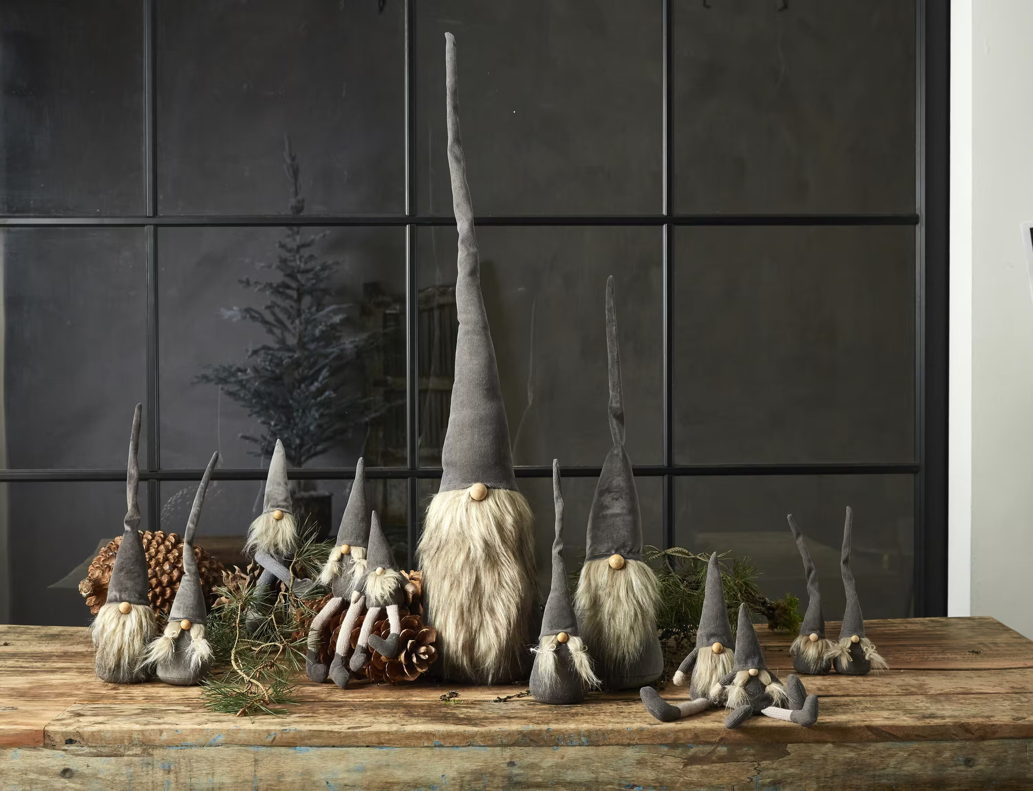 Bilden från Köpstaden.se visar en samling tomtar i olika storlekar, arrangerade på en robust träyta framför en bakgrund av mörka stålramade fönster. Dessa tomtar, som bär varumärket Speedtsberg, är klädda i enhetliga gråa velourtyger. Materialets textur verkar mjuk och inbjudande, vilket ger en varm känsla till dekorationen.