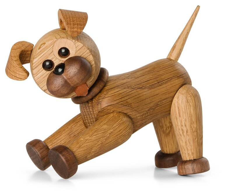 Det som gör Happy extra speciell är att den består av 31 rörliga delar. Du kan enkelt vrida och justera den så att hunden kan stå, sitta, ligga – och skapa nya uttryck när du vill. En unik detalj som går att forma efter just din stil.