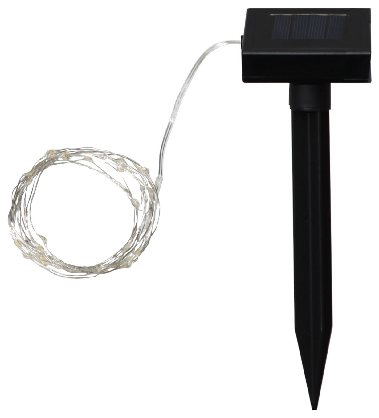 Ljusslinga Dew Drop för utomhusbruk med 50 LED-lampor i varmvitt, en dekorativ ljusslinga med separat panel som kan placeras i solen medans själva ljusslingan kan användas i skuggan. Tänds & släcks automatiskt via ljussensor & lyser i ca 5 timmar.