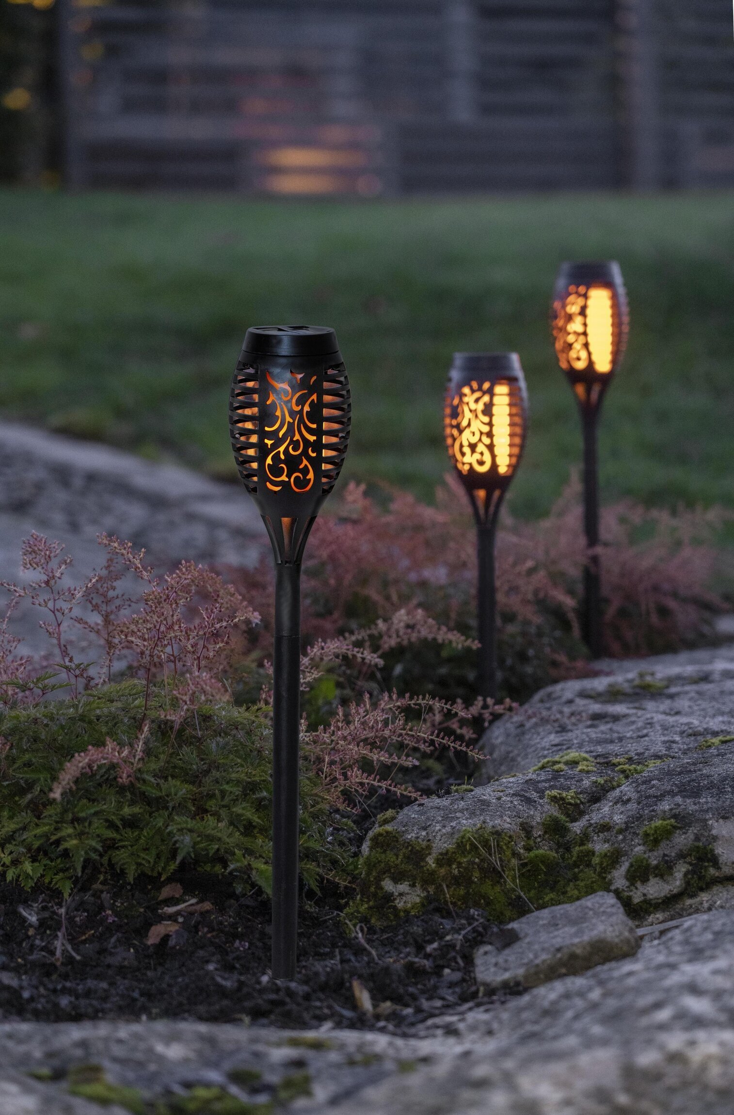 Solcellsdrivna mini facklor i set om 3 stycken med dansande låga, en fin detalj i trädgården eller på balkong. Från Star Trading.
