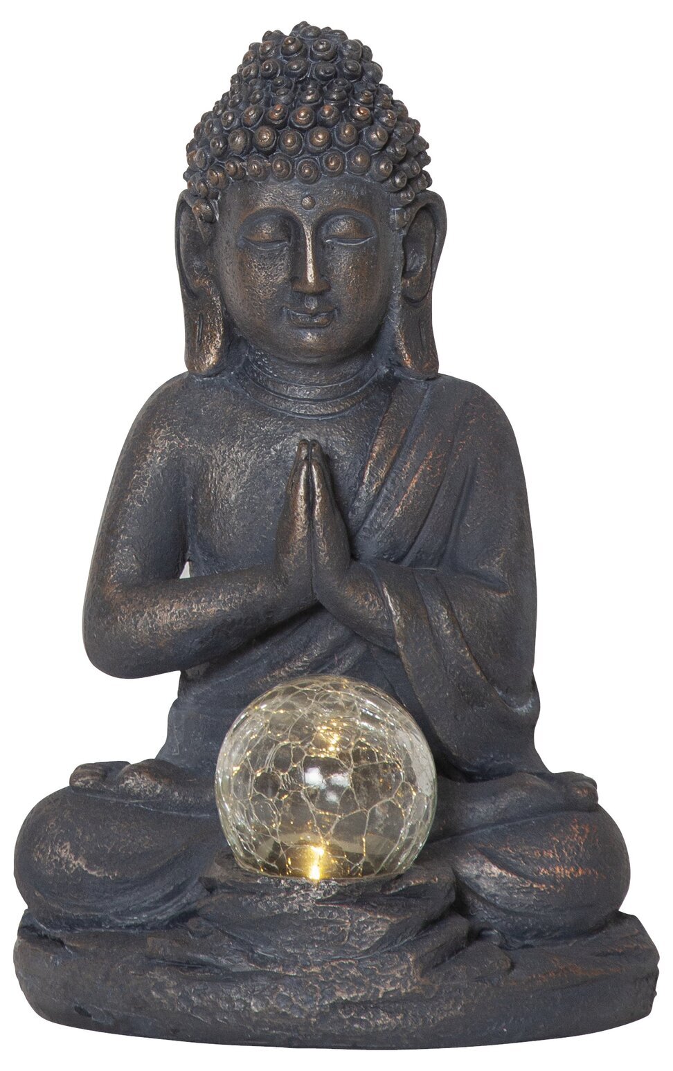 Bilden från Köpstaden.se föreställer en detaljerad solcellsdekoration från varumärket Star Trading, kallad Buddha. Statyn visar en sittande Buddha-figur med händerna sammanfogade i en meditationsgest. Figuren är skapad med omsorg om detaljerna, vilket framträder tydligt genom den texturerade ytan som liknar sten eller brons. Den mörka ytan ger en naturlig patina, vilket förstärker intrycket av en tidlös dekorationsartikel.