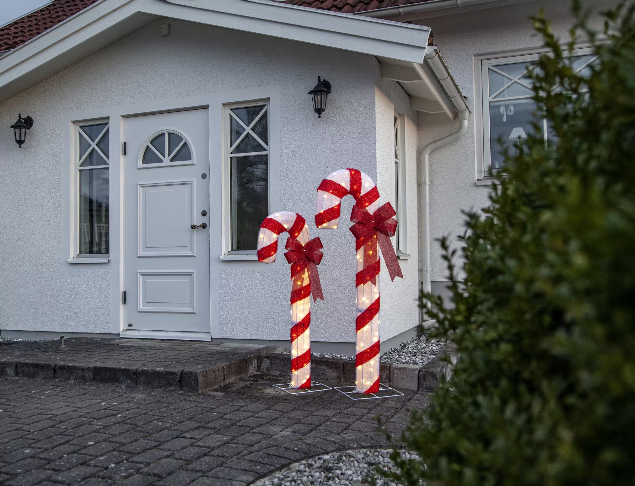 Bilden från Köpstaden.se visar en trivsam entré till ett hus, där utomhusdekorationen CandyCane Large från varumärket Star Trading står i fokus. I förgrunden av bilden ser vi två stora dekorativa polkagrisar, strategiskt placerade på båda sidor om en gångstig som leder fram till husets dörr. Dessa imponerande dekorationer är utformade som klassiska polkagrisar, med ränder i lysande rött och vitt.