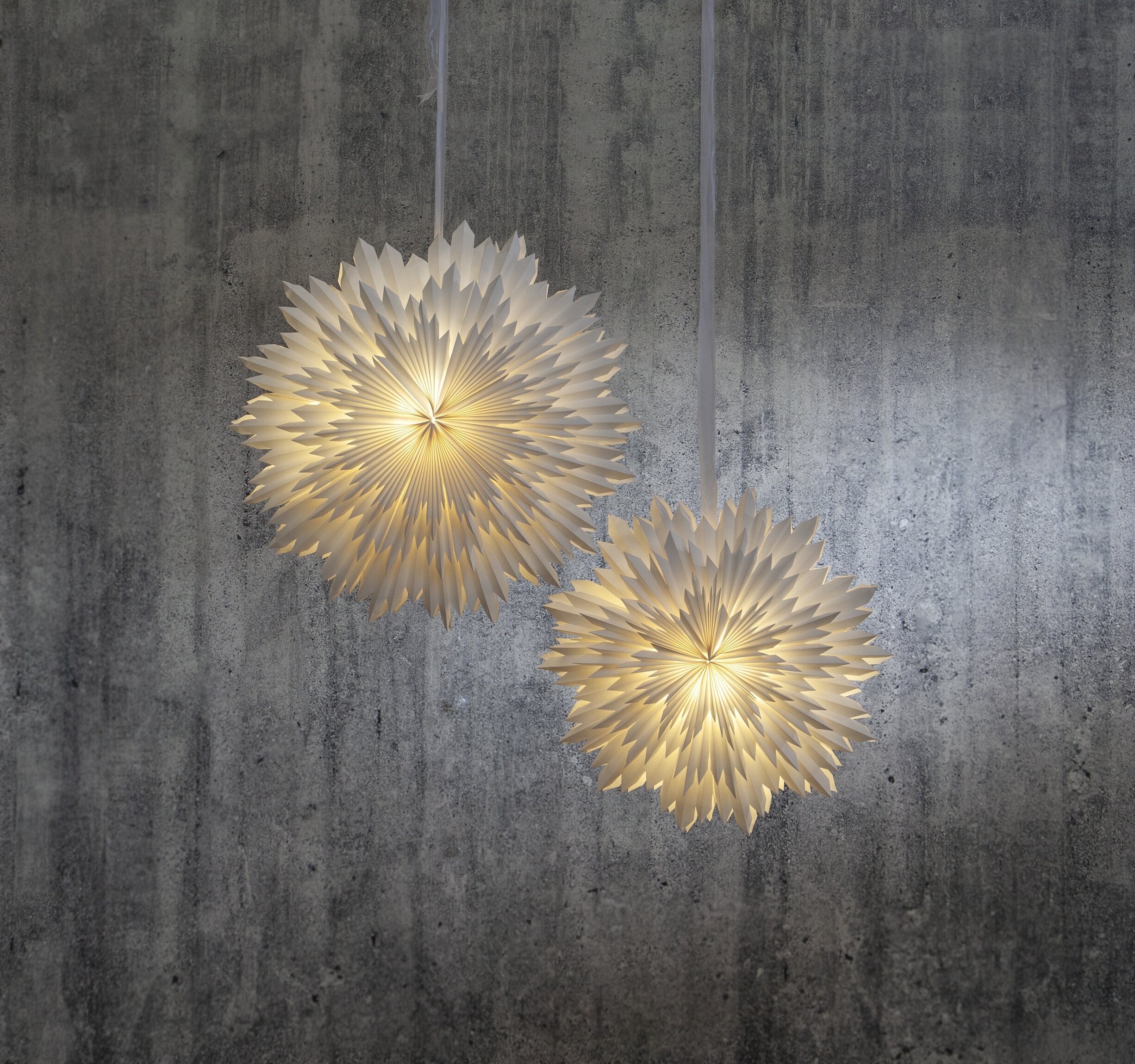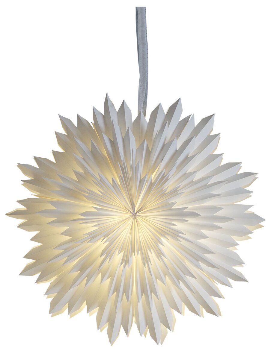 Vacker vit pappersstjärna, tillverkad av 3 lager veckat papper med ojämn kontur för en vintrig känsla. Elegant band medföljer för att enkelt kunna hänga upp stjärnan i fönster eller på vägg.