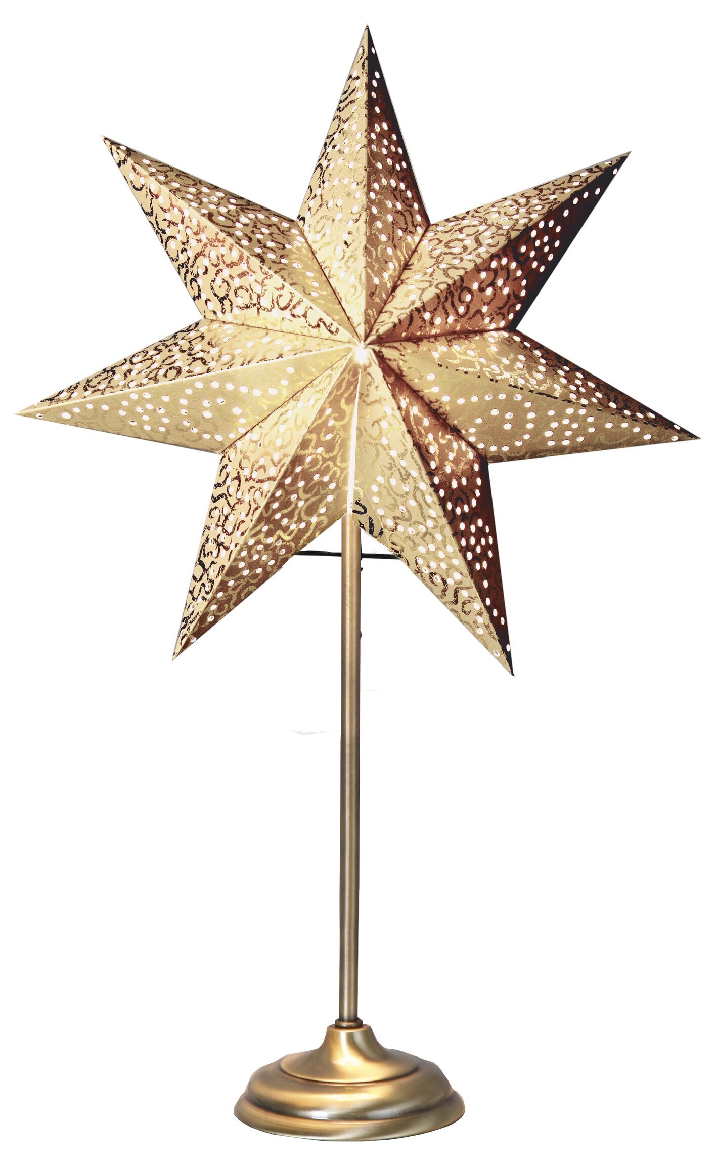 Bilden från Köpstaden.se visar en produkt från Star Trading, kallad Stjärna På Fot Antique Gold. På bilden domineras motivet av en stjärna i en gyllene färgton, noggrant designad med detaljerade utskärningar som släpper igenom ljuset för en strålande effekt. Denna stjärna, som är monterad på en stabil fot, står på en elegant ställning. Foten smälter samman med resten av designen, vilket skapar en harmonisk balans i hela strukturen.