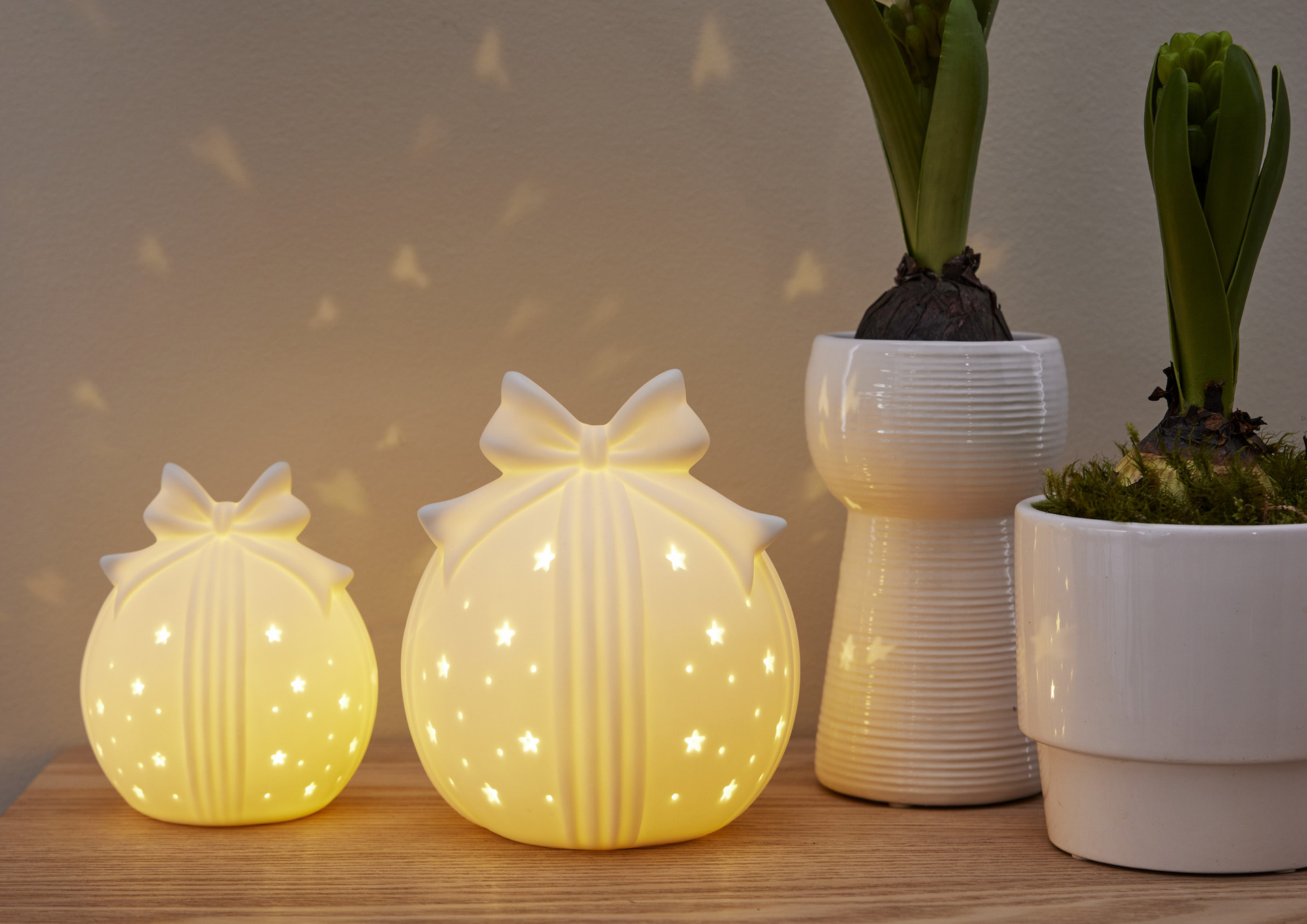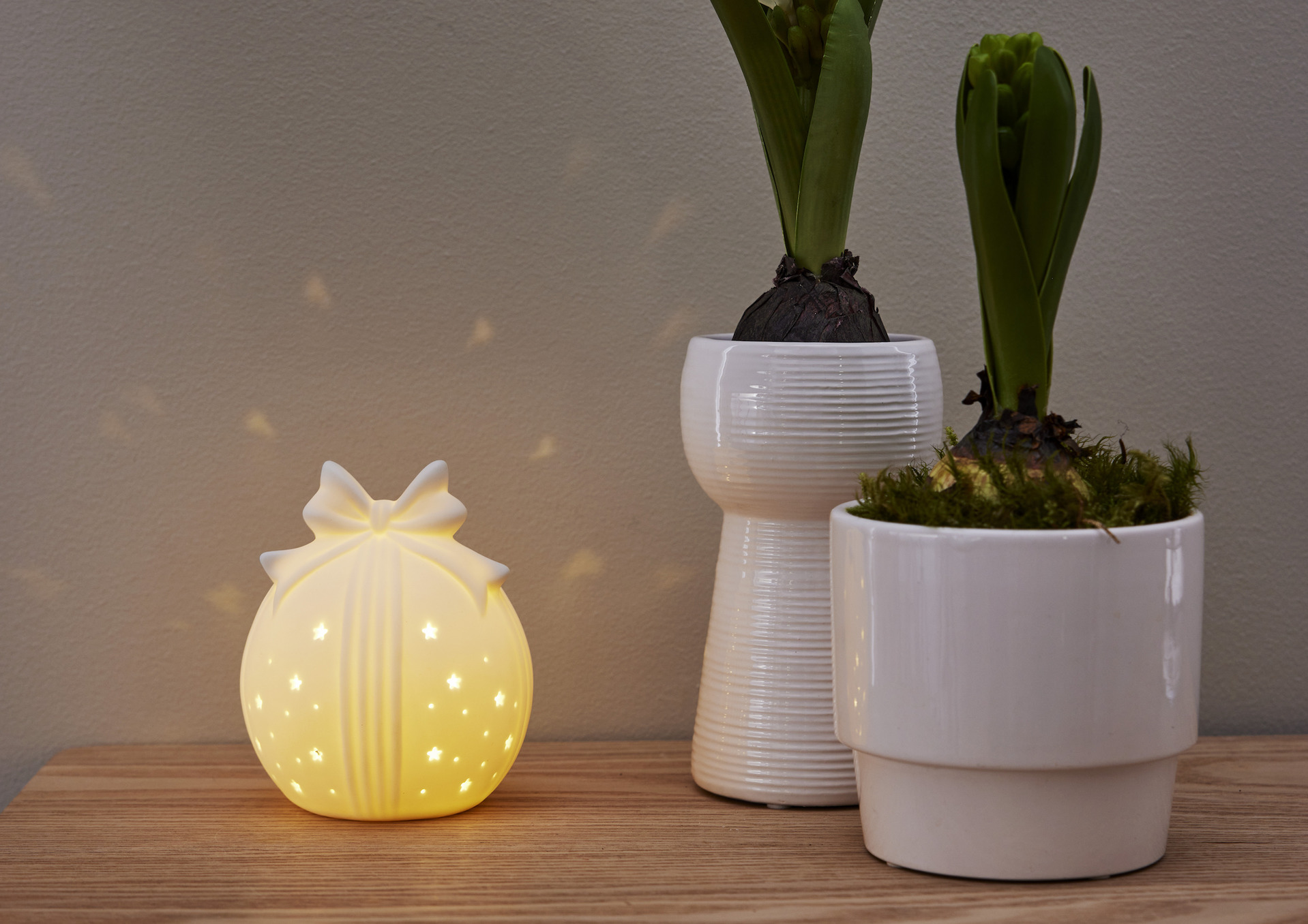 En vacker bordsdekoration i vitt porslin som sprider ett varmt, stämningsfullt sken genom små utskurna stjärnor. Läs mer