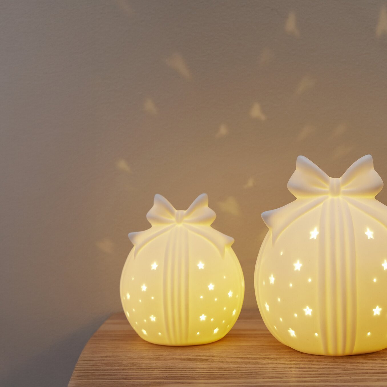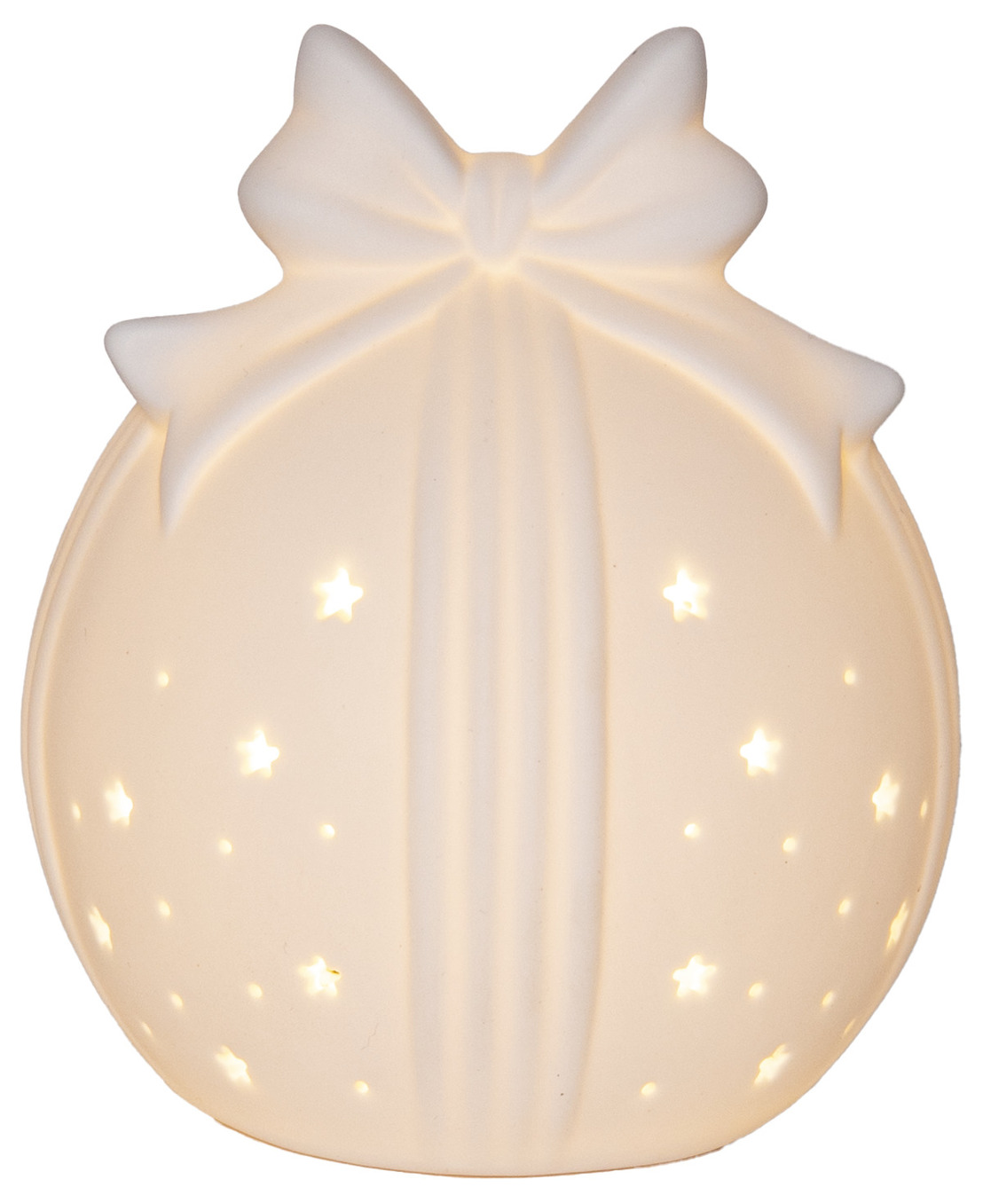En vacker bordsdekoration i vitt porslin som sprider ett varmt, stämningsfullt sken genom små utskurna stjärnor. Den formade rosetten upptill ger ett elegant och lekfullt uttryck – perfekt till julbordet, fönsterbrädan eller som en mysig detalj året runt.