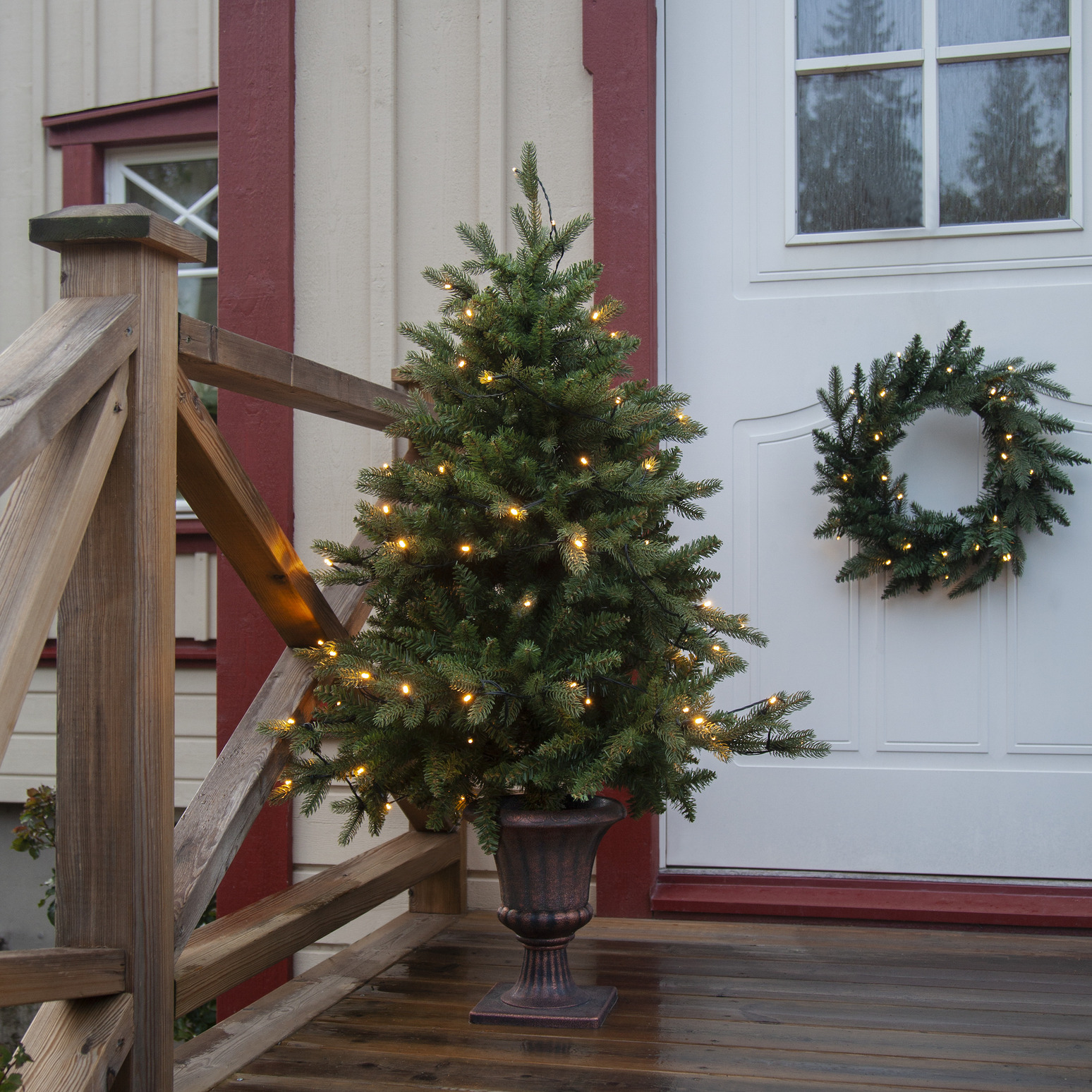 I bakgrunden syns husets entré, där en krans av barr hänger på den vita dörren. Kransen matchar perfekt granen i både färg och tematik, vilket skapar en harmonisk helhet. Dörren är delad i paneler och har en enkelt dekorerad ruta upptill som släpper in ljus.