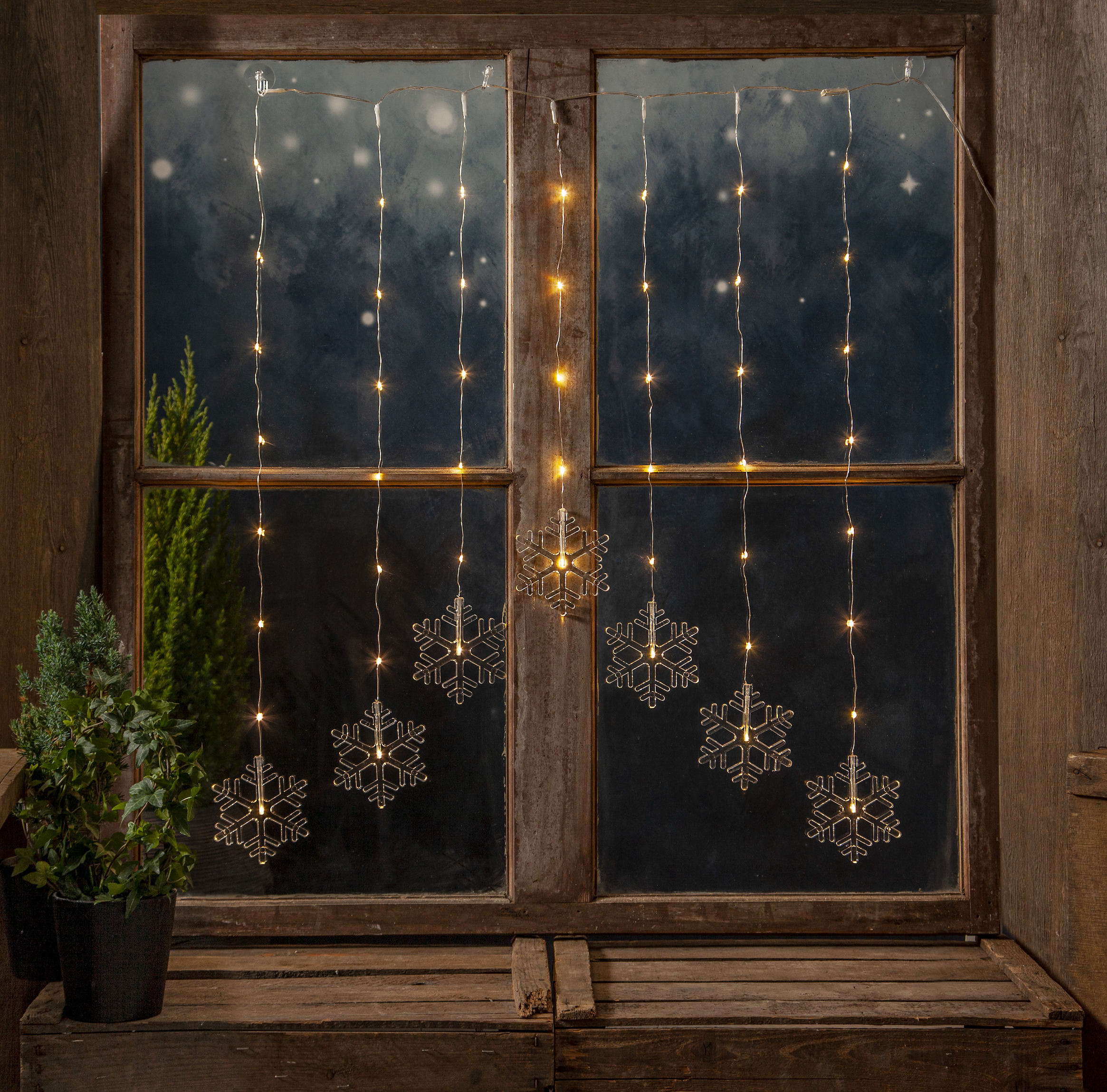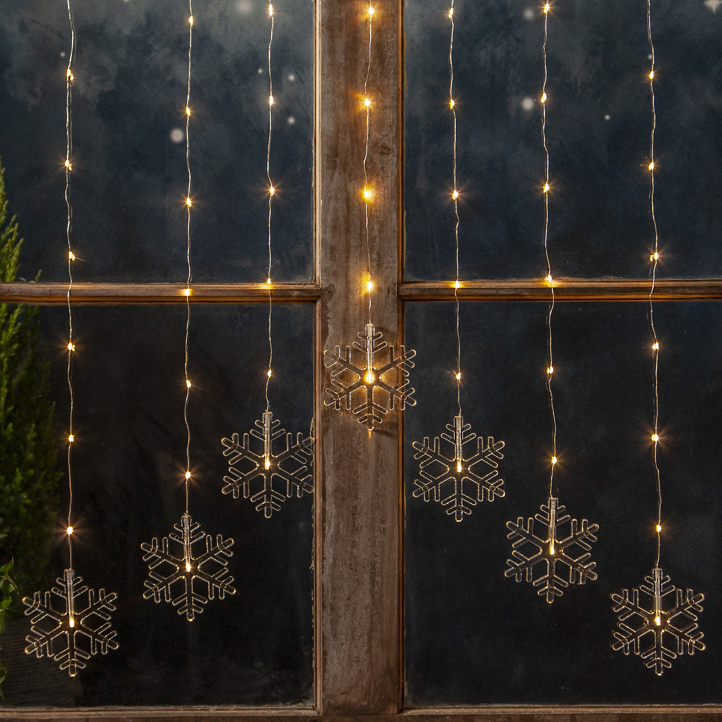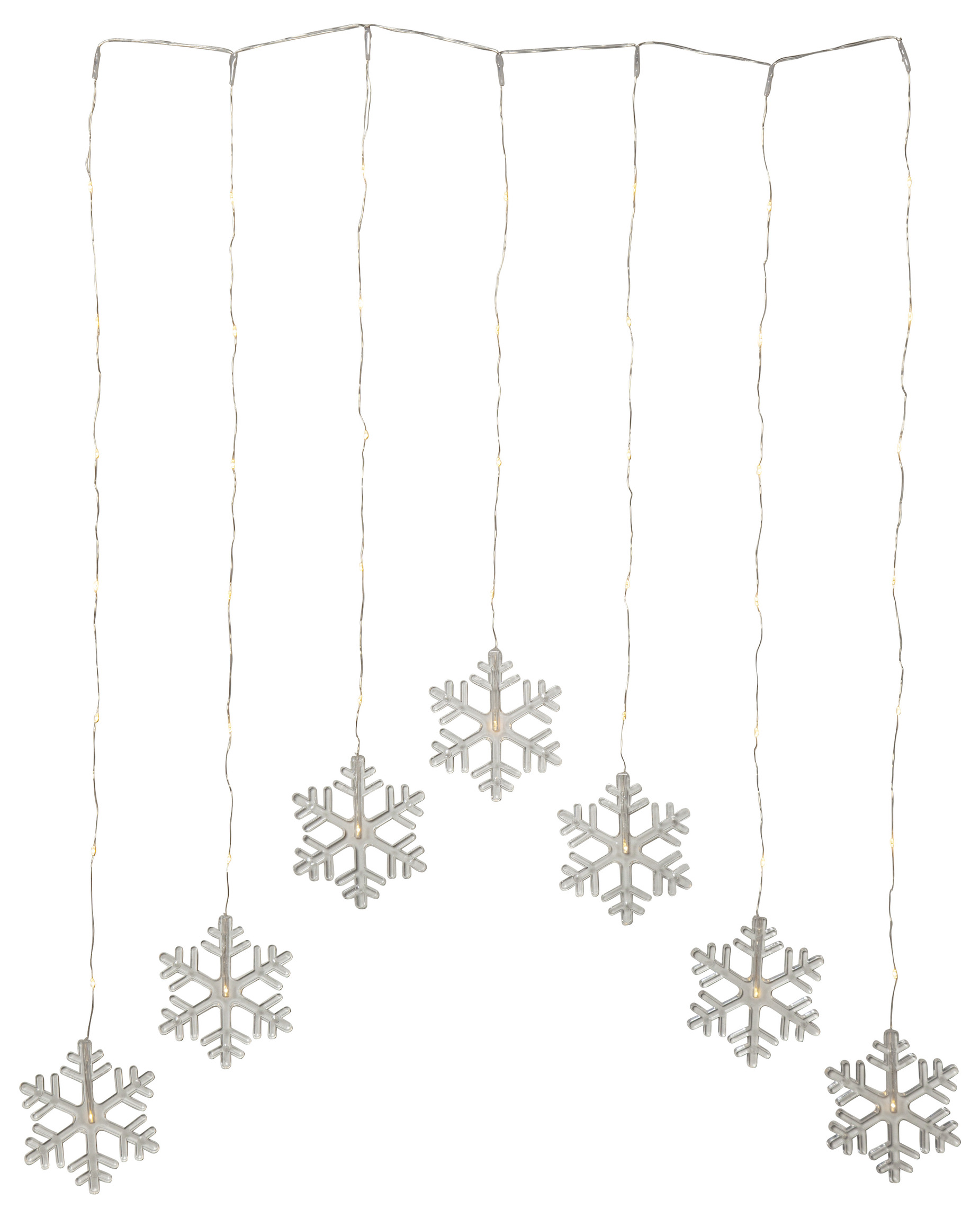 Vacker ljusgardin med hängande snöstjärnor (LED) som ger ett stämningsfullt och elegant inslag till dina fönster under vintern. Ljusgardinen lyser upp med ett mjukt och behagligt sken som passar perfekt till juldekorationer eller för att skapa en mysig atmosfär i hemmet.