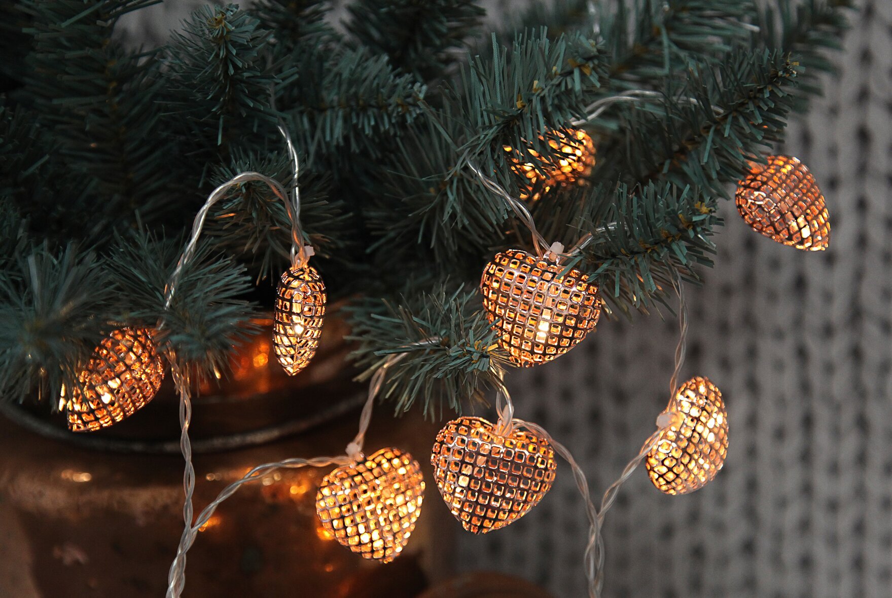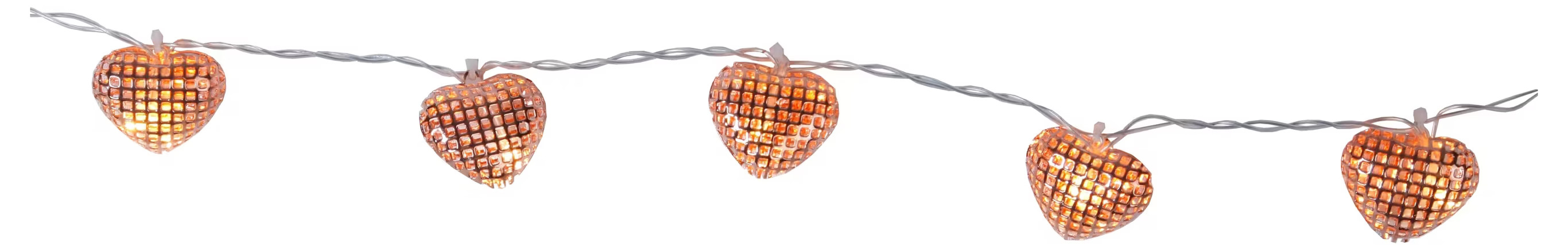 Snygg ljusslinga i koppar med 10 stycken vackra hjärtan som lyser med små LED-lampor, brinntid ca 100 tim. Ljusslingan har även en timer 6-18 repeat, smidigt att låta den tända sig självt. Ljusslingan kräver 3 st AA batterier (medföljer ej) & har en effekt på 0,3 W. Snygg att dekorera i bl a glaskupor eller genom att framhäva vissa inredningsdetaljer. Endast för inomhusbruk.