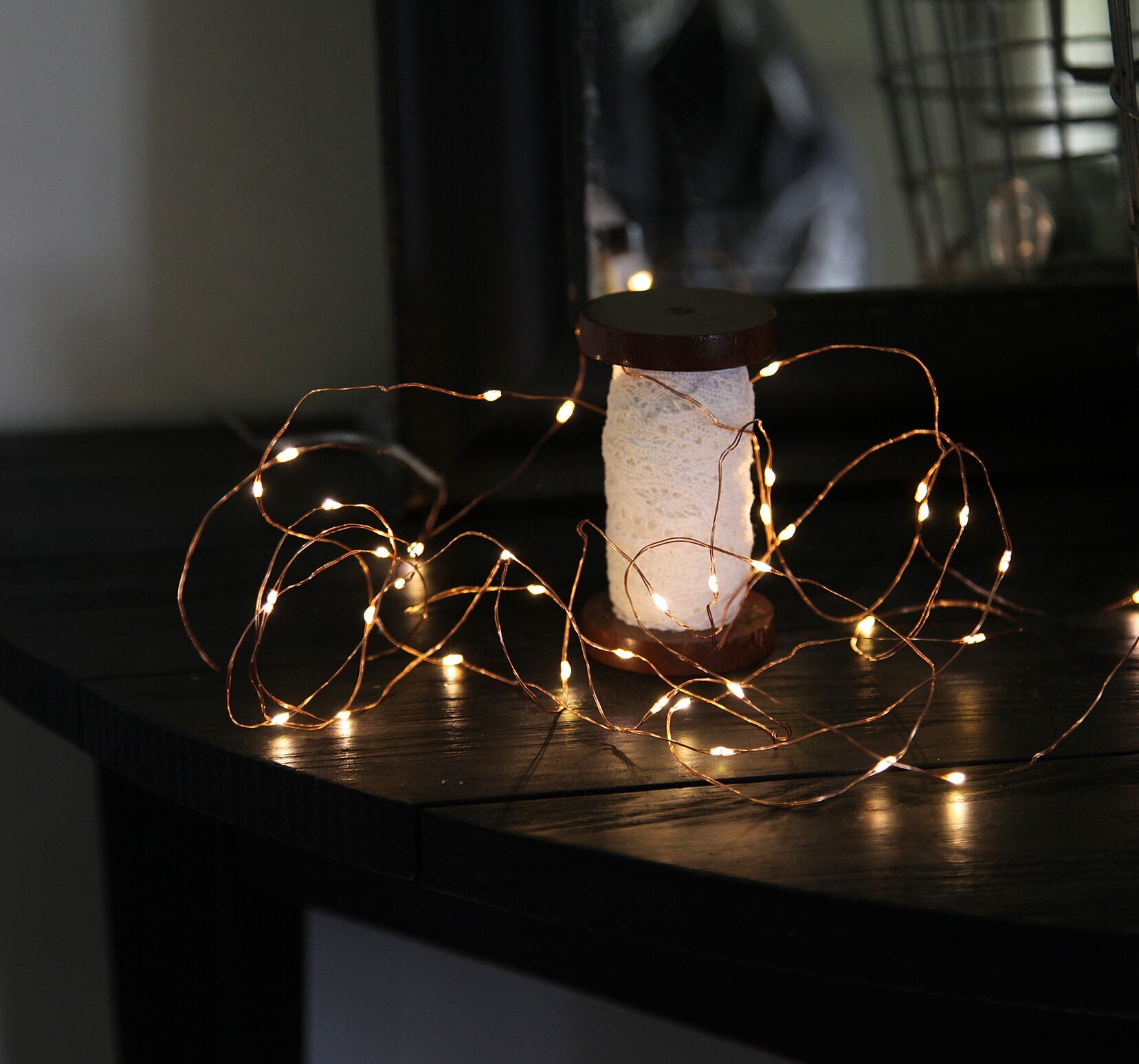 Snygg ljusslinga, med timer, i koppar med 40 små LED-lampor, brinntid ca 100 tim. Ljusslingan kräver 3 st AA batterier (medföljer ej). Effekt 1,2 W. Snygg att dekorera i bl a glaskupor eller genom att framhäva vissa inredningsdetaljer. Endast för inomhusbruk.