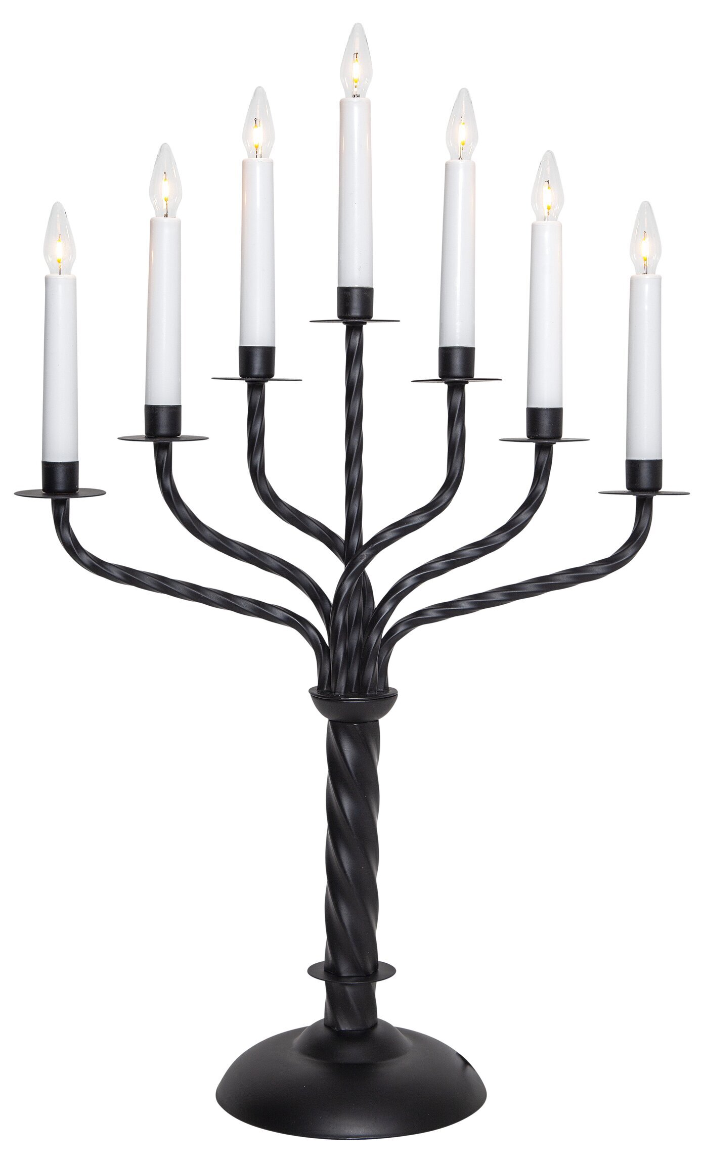 Ljusstaken har sju armar, vilket ger den en imponerande och bred form. Var och en av armarna är elegant vridna, vilket skapar en visuell dynamik och ger en intressant struktur. Dessa armar sträcker sig symmetriskt från den centrala vertikala staven, som också är vackert tvinnad.