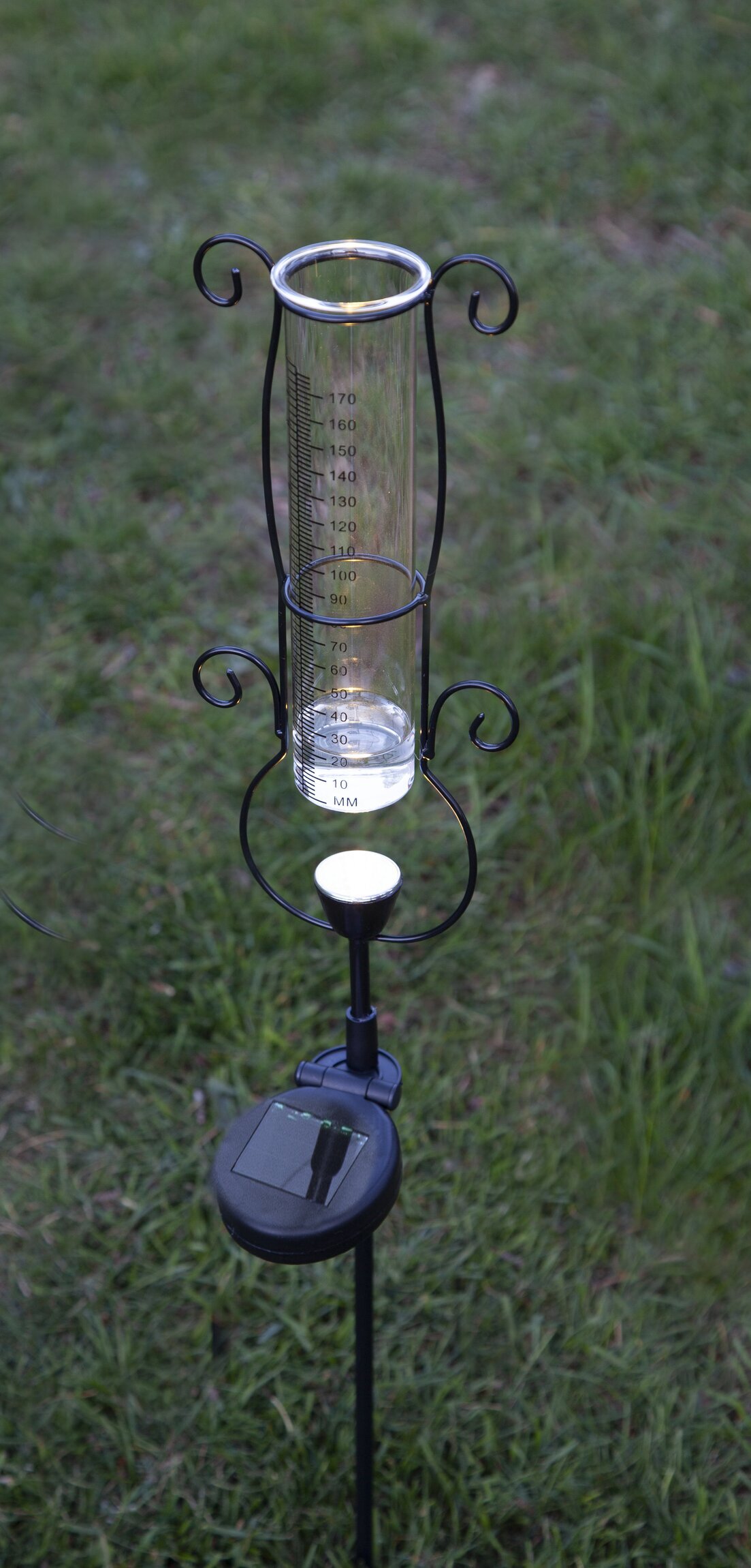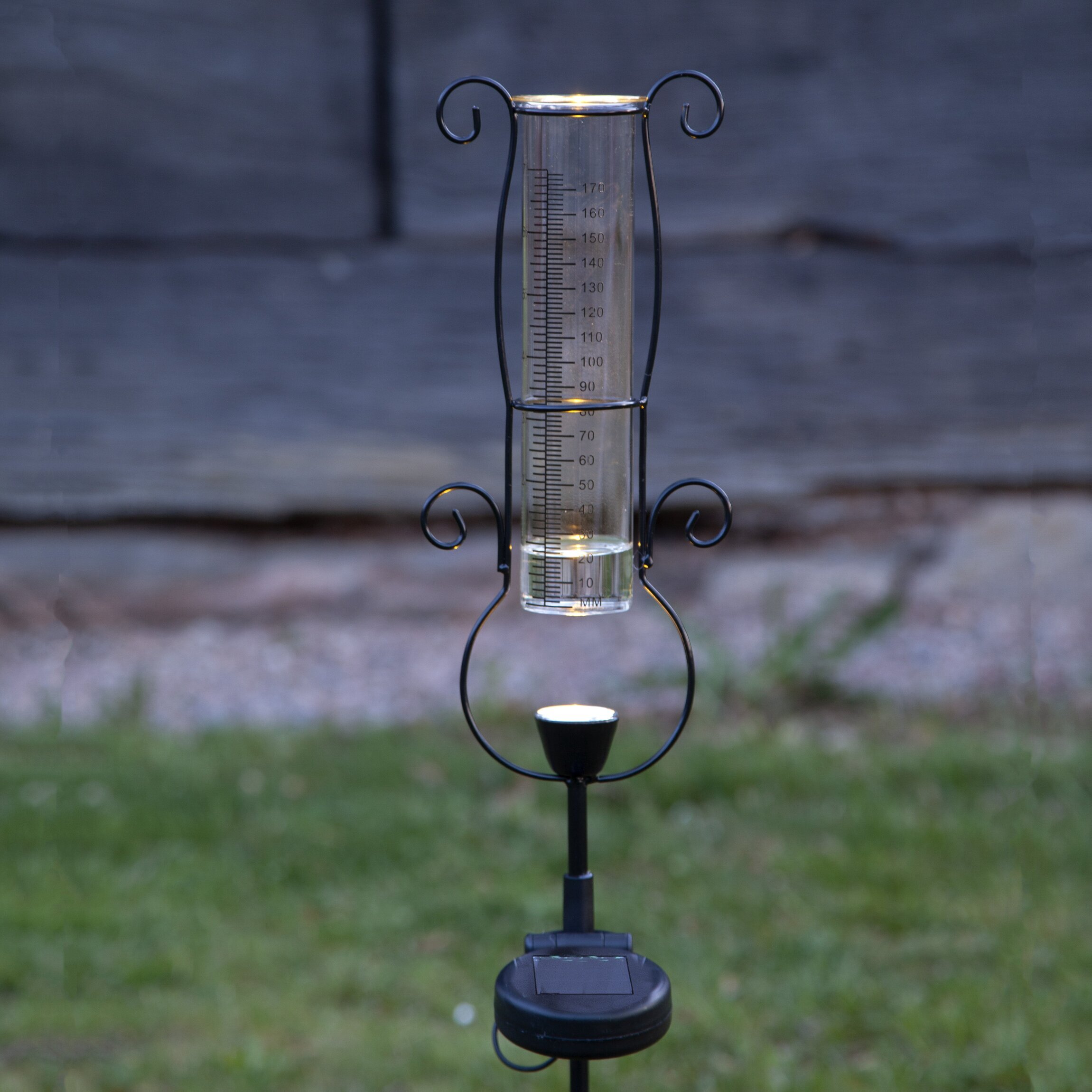 Dekorativ regnmätare med varmvit belysning, en vacker detalj i trädgården. Regnmätare har millimeter samt inch skala. Från Star Trading.