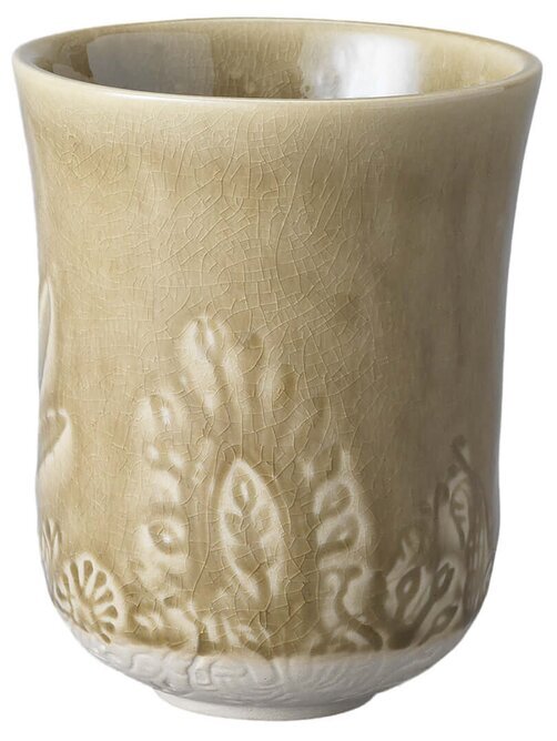 Muggen har en mjuk, sandfärgad nyans som påminner om varma, soliga stränder. Ytan är lätt krackelerad vilket ger en känsla av patina och djup till dess annars släta yta. Den utsökta reliefen av blom- och bladmönster i det undre bandet av koppen är särskilt slående. Dessa mönster skapar både en visuell och taktil upplevelse, där varje linje är precist utmejslad mot bakgrunden.