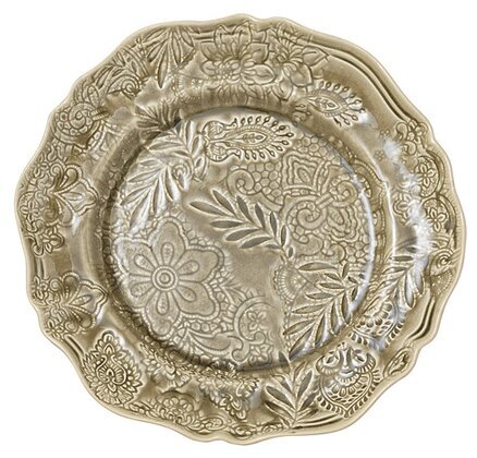 Bilden föreställer ett runt fat från Köpstaden.se, speglat genom sin unika design och uttrycksfulla detaljer. Färgen, beskriven som Arabesque Sand, ger fatet en jordnära nyans som påminner om mjuk sand. Detta fat ingår i kollektionen från Sthål, och ytan är dekorerad med ett intrikat mönster av blom- och bladmotiv, som för tankarna till traditionell arabesk-design.