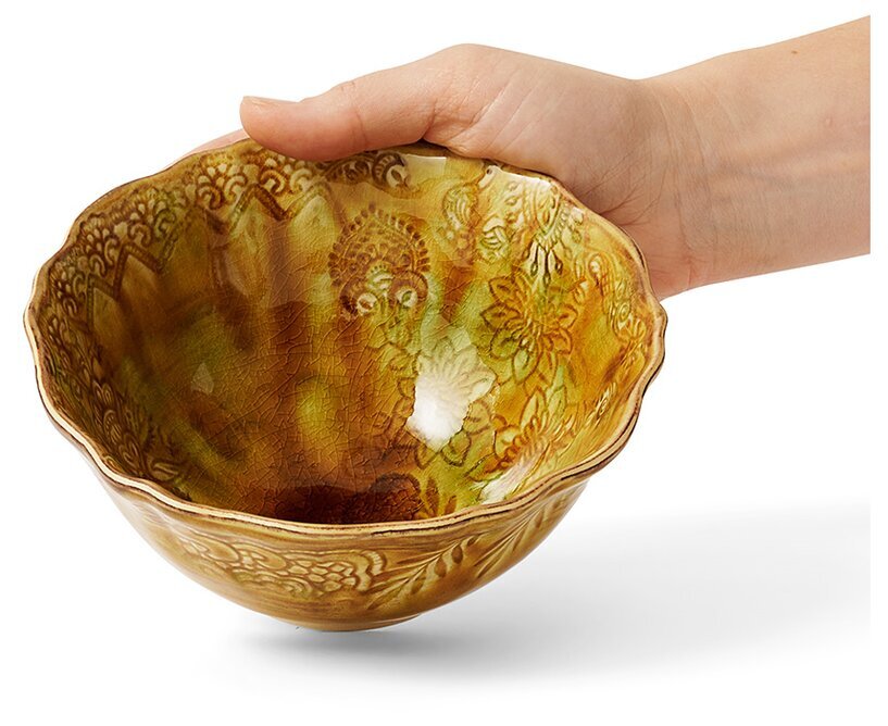Färgerna går i varma nyanser av brunt och guld, som tillsammans skapar en jordnära och harmonisk känsla. Interiören i skålen visar en glaserad yta med glänsande finish, vilken reflekterar ljus och framhäver de intrikata detaljerna i mönstret. De subtila krackeleringarna i glaseringens yta tillför ännu en dimension av textur och djup.