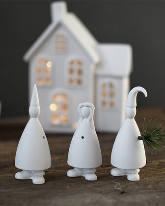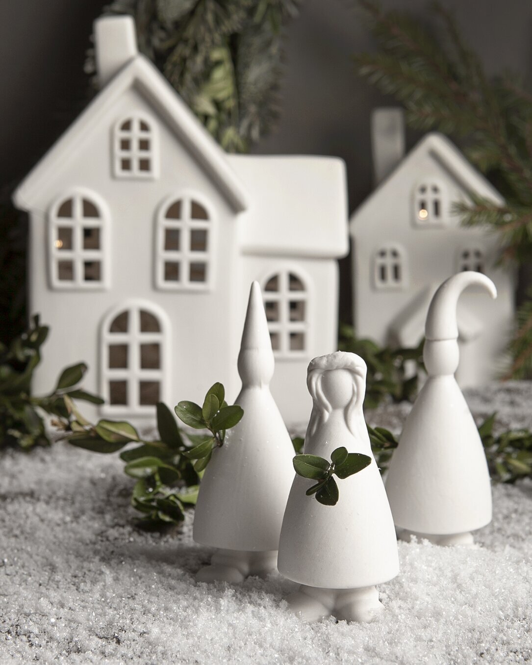 Vacker luciadekoration i matt vit keramik. Varje figur har ett litet hål på magen där en grön kvist kan fästas.