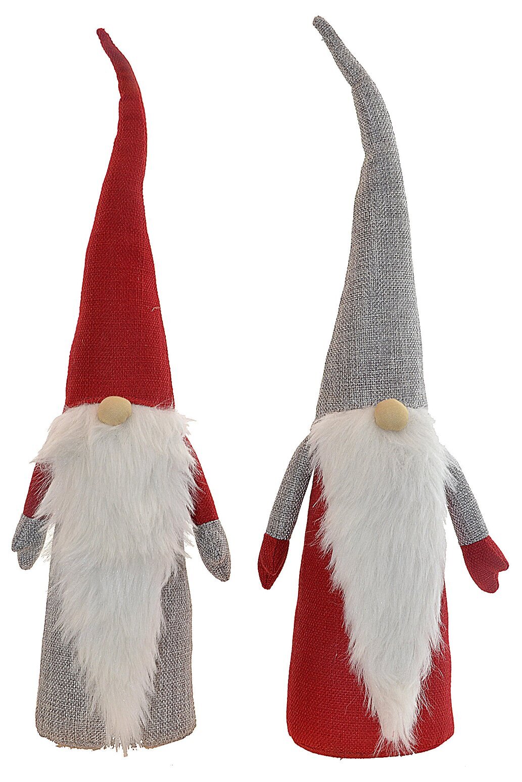 Den andra tomten, till höger, har en lika spetsig luva, men i en stilfull grå nyans som ger en mer dämpad och klassisk känsla. Även denna tomte har ett frodigt, vitt skägg som är fluffigt och ser mjukt ut att röra vid. Kroppen här är täckt i ett djupare rött tyg, vilket kompletterar den grå luvan på ett harmoniskt sätt.