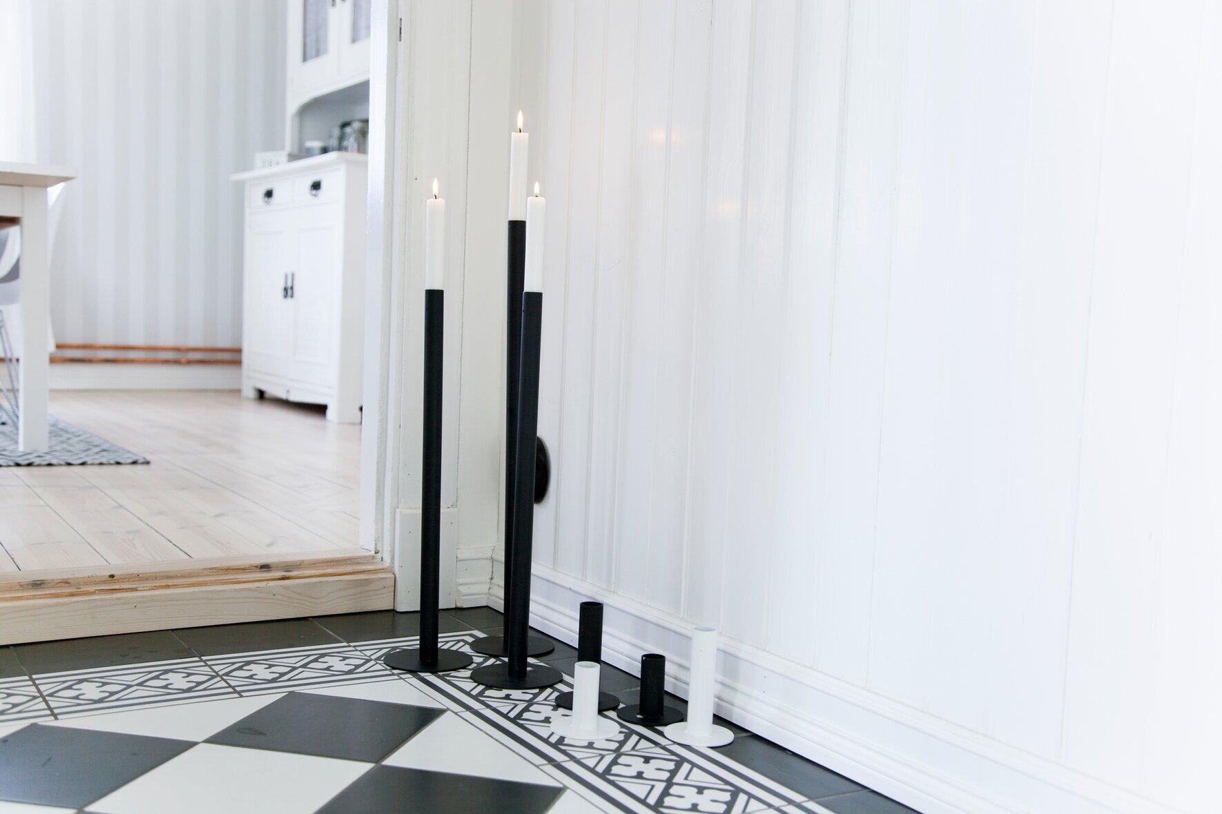 Bilden visar en stilren och funktionell inredningsdetalj från produktsortimentet hos Köpstaden.se. Fokus ligger på Ekeberga ljusstake i en liten, vit variant från märket Storefactory. Den är placerad på ett dekorativt rutigt golv som är delvis svart och vitrutigt, vilket kontrasterar elegant med den ljusa väggen bakom. Väggpanelen i vitt ger ett skandinaviskt och modernt intryck, vilket harmoniserar väl med ljusstakens minimalistiska design.