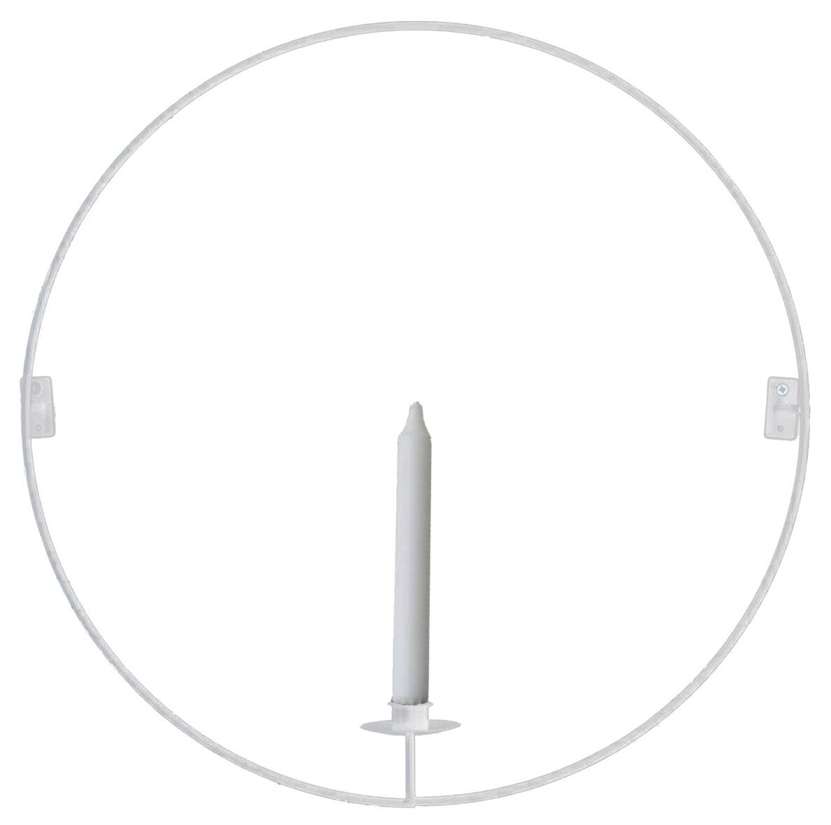 I mitten av denna cirkulära ram fästs ett stearinljus. Ljuset är traditionellt format och ger, när det är tänt, ett varmt och inbjudande sken som sprider sig mjukt över omkringliggande väggar och ytor. Ramen är robust konstruerad för att hålla ljuset säkert på plats utan att kompromissa med estetik.