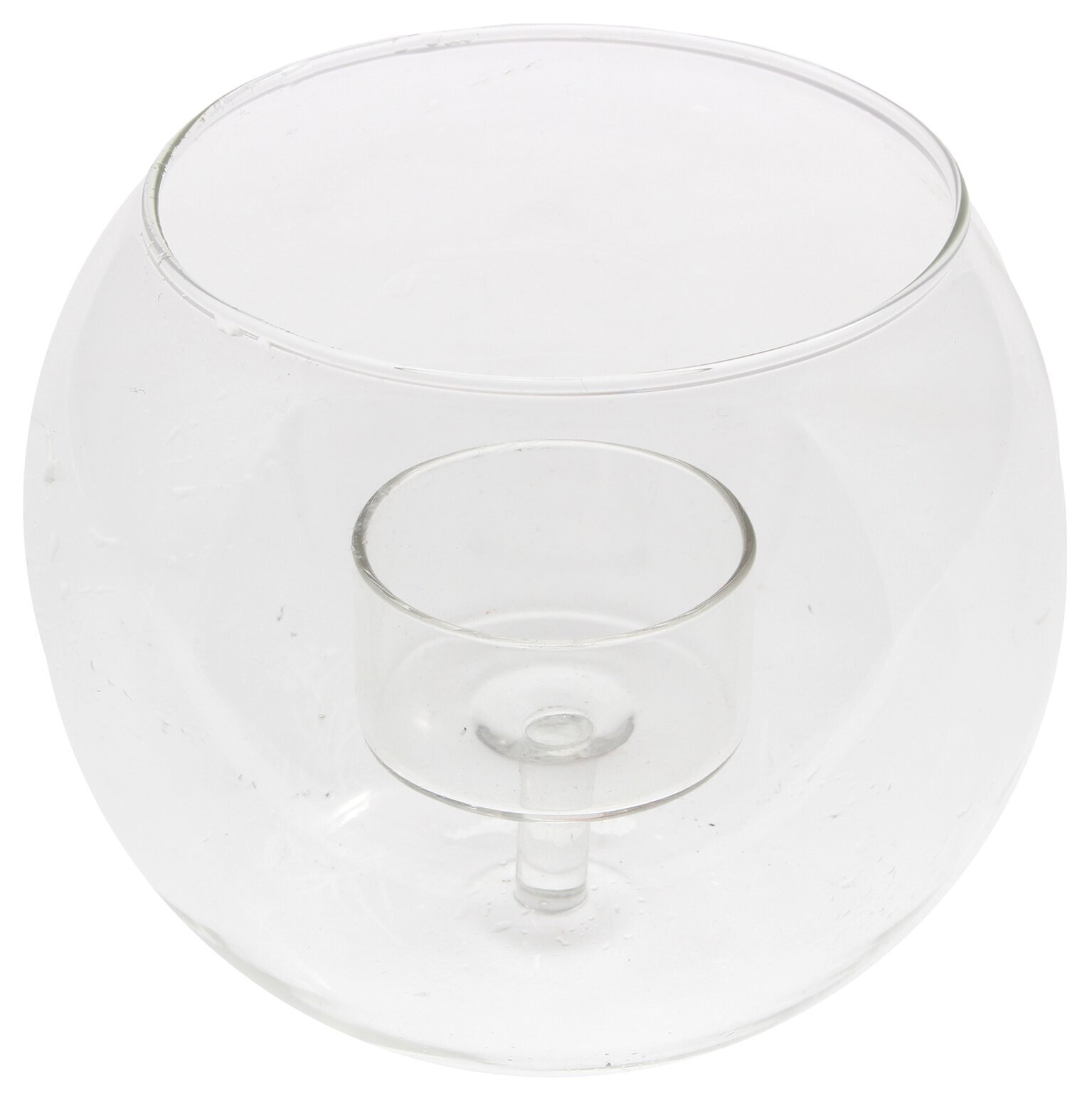 I centrum av glasbollen finns en inre cylinder, också tillverkad av glas, vilket ger en lagom kontrast mot det sfäriska ytterskalet. Detta inre element verkar vara designat för att fungera som en bas för ett ljus, vilket ger möjligheten att använda bollen som en modern ljuslykta eller en ovanlig ljushållare. Att glaset är klart och transparent skapar ett stilrent utseende, och belysningen skulle i så fall kunna sprida ett behagligt ljus genom det omslutande glaset.