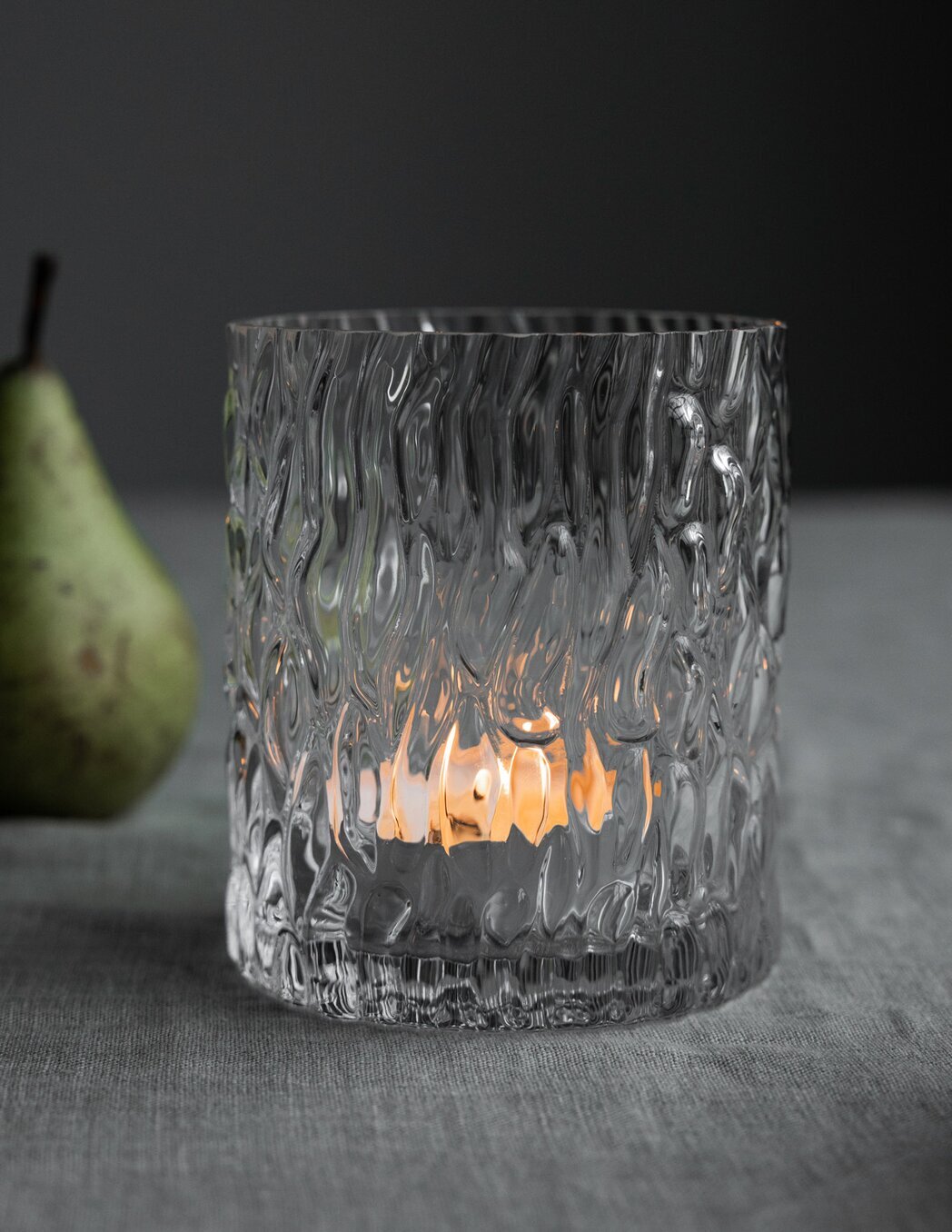 Till vänster om ljuslyktan syns en päronformad frukt som bryter av med sin matta, gröna yta. Fruktens placering tillför inte bara en färgkontrast utan även en organisk form som kompletterar den industriella känslan av glasets hårda yta. Sättet frukten är delvis i skugga skapar en intressant balans i bilden, där ljuset från Bubblig Stor drar uppmärksamheten till sig.
