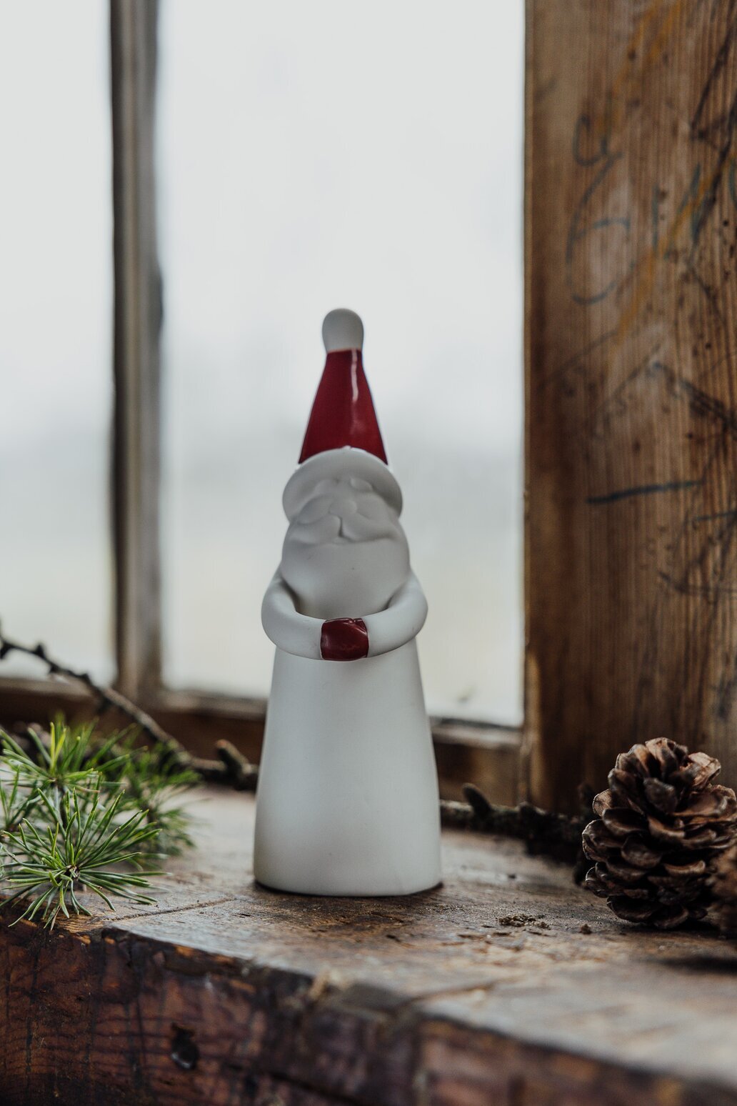 Tomte Loke Liten är noggrant utformad i en neutral, mjuk vit färg, vilket ger den en klassisk och tidlös stil. Den lilla tomtens röda mössa och matchande handskar ger en fin kontrast till dess vita kropp och fångar direkt ögat. Mössan är spetsig och traditionell i sin design, vilket påminner om den klassiska bilden av en svensk tomte.
