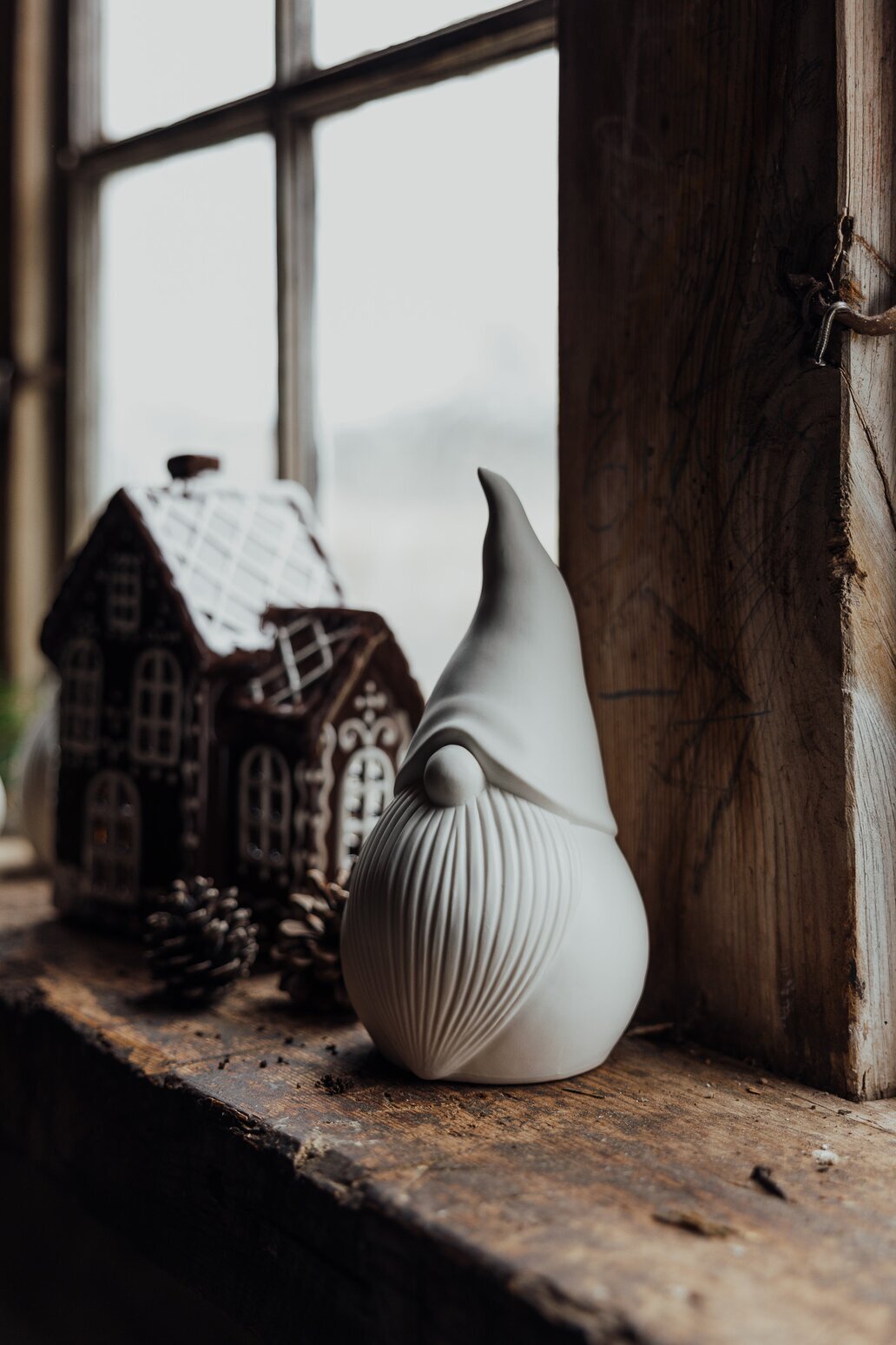 Detaljerna i tomtens skägg är noggrant skulpterade med vertikala linjer som ger en illusion av textur och fyllighet. Materialet är av keramik, vilket ger figuren en len och enhetlig yta. Den neutrala färgen gör att tomten enkelt kan passa in i olika inredningsstilar, oavsett om det är modernt eller traditionellt.