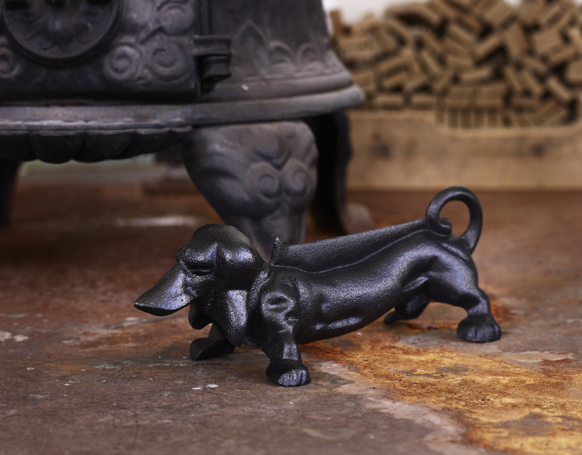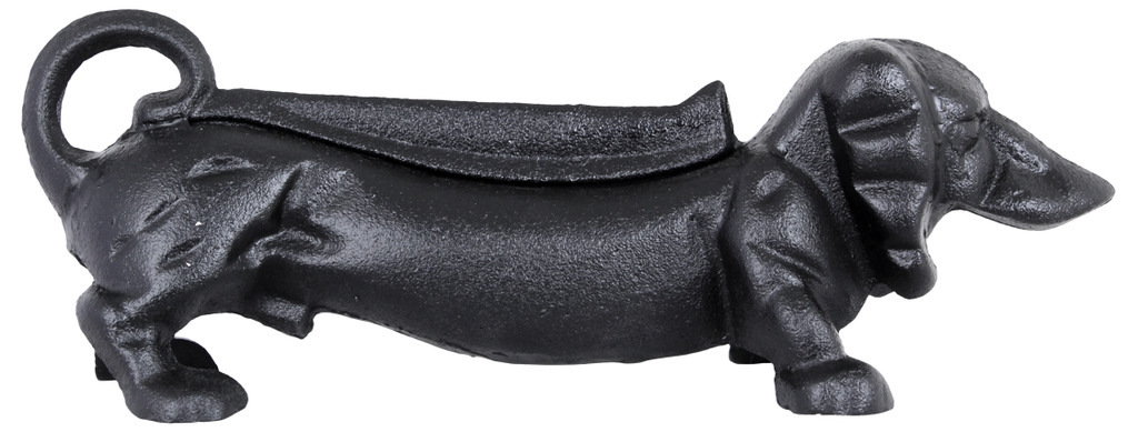 Cool fotskrapa i järn i form av en tax, en fin inredningsdetalj till bl a verandan. Fotskrapan kan även användas inomhus i en eldstad som eldhund. Vid användning utomhus vid fuktigt väder kan gjutjärnet patineras.