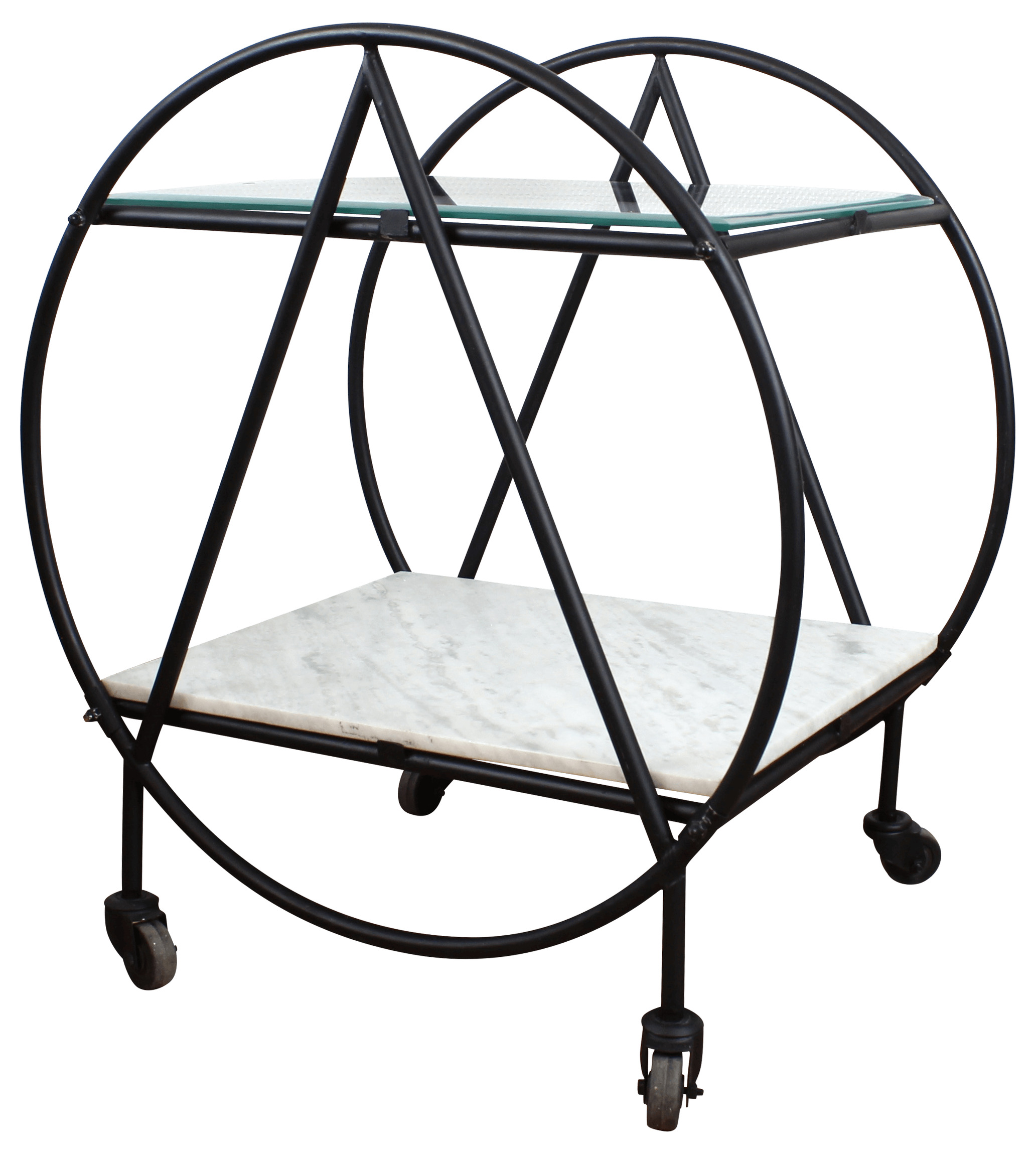 Vagnen står på fyra hjul, vilka gör det enkelt att flytta den mellan olika utrymmen. Den övre hyllan består av glas, vilket ger en elegant touch och gör det möjligt att visa upp en variation av föremål, från glas och flaskor till dekorativa element. Den nedre delen av vagnen har en bas av vit marmor, vilket skapar en kontrast mot den svarta metallstrukturen och ger en lyxig känsla av tyngd och stabilitet. Marmorens diskreta ådring tillför ytterligare visuell intressant utan att ta över designen.