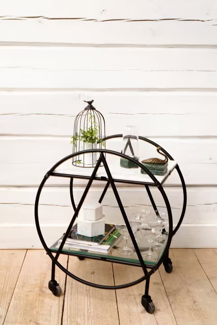 Vagnen står på fyra svarta, diskreta hjul som smälter in i det omgivande träplankgolvet, vilket ger en mobilitet och flexibilitet i dess användning. Dess förmåga att enkelt flyttas runt gör den till en praktisk tillgång i varje hem, perfekt för att servera drycker eller föra fram snacks under en social tillställning.