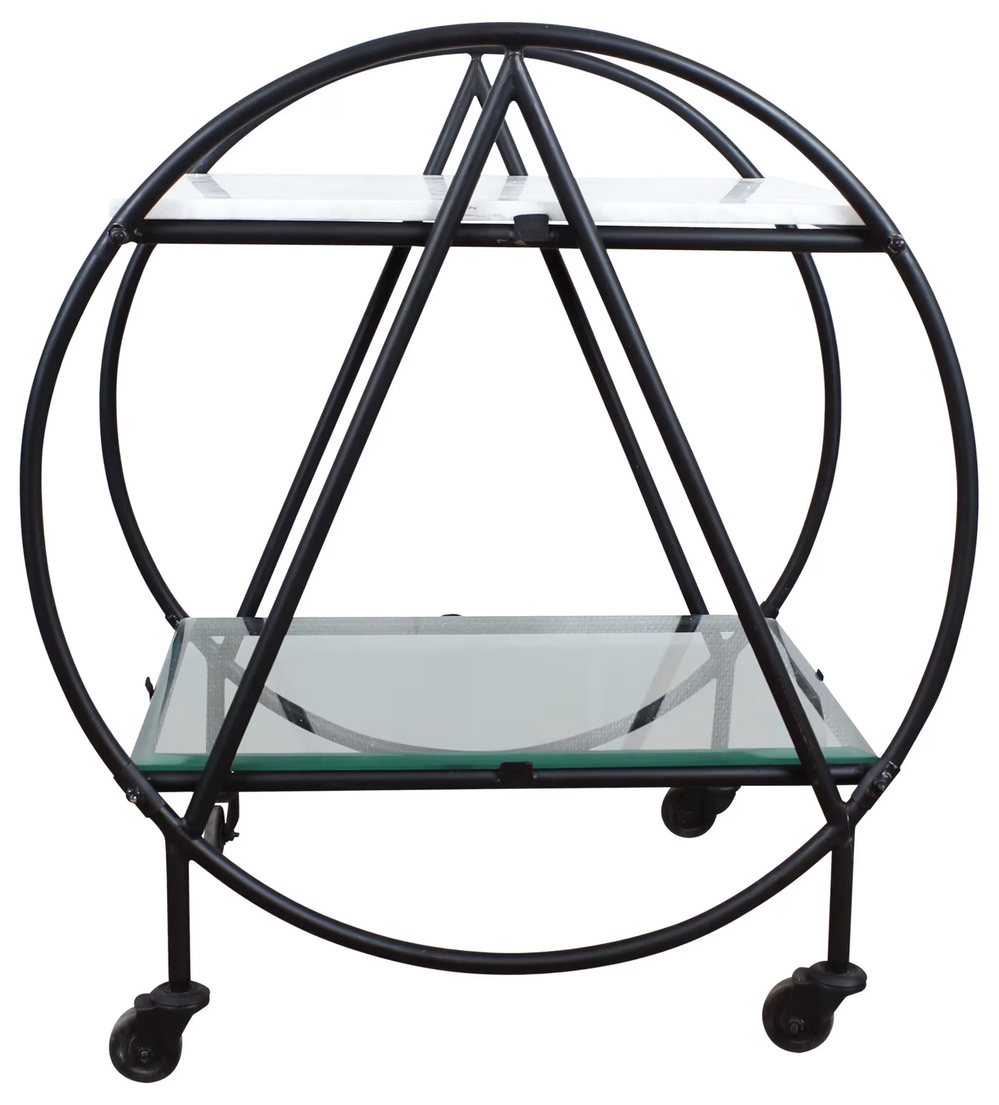 Fokus i bilden ligger på vagnen som präglas av sitt unika formspråk. Ramen är tillverkad av svart metall, vilken ger en stabil och samtidigt modern känsla. Formen på vagnen är cirkulär och denna geometriska design med sina rena linjer skapar ett diskret men samtidigt framträdande uttryck i rummet. Vagnen har två hyllplan, vilket maximerar dess användningsområden för servering eller förvaring.