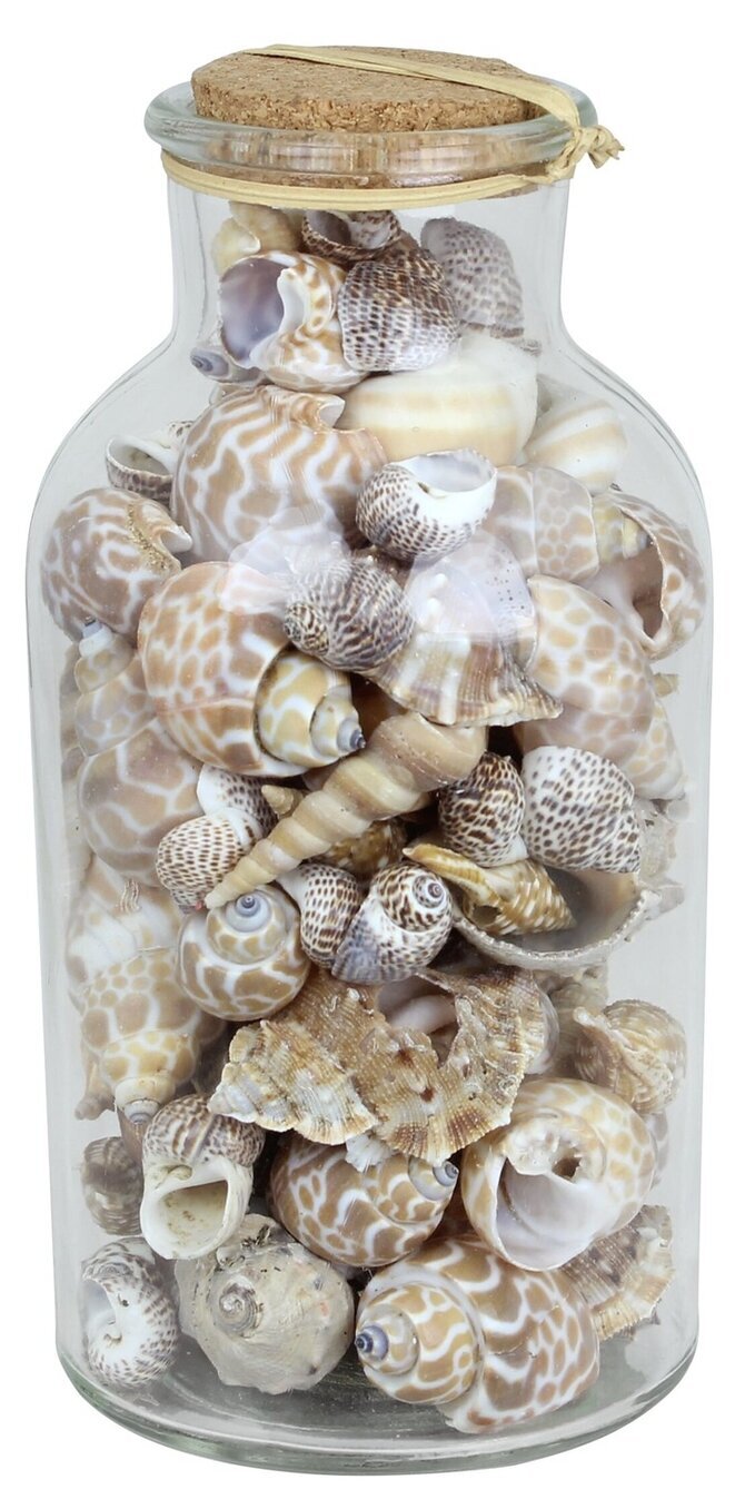 Glasburk med korklock fylld med vackra blandade snäckor, från Strömshaga.