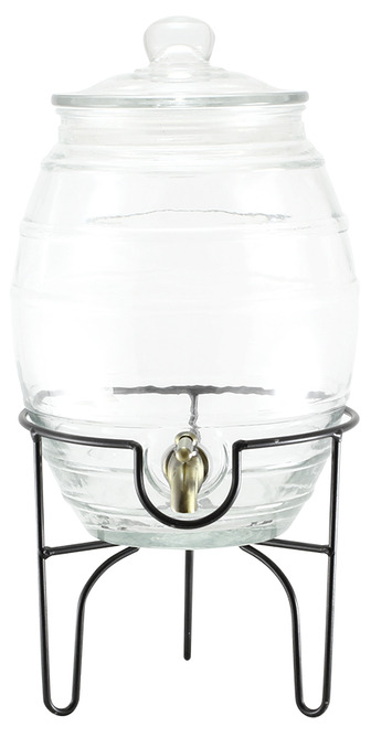 Framträdande på burkens nedre del finns en kran i en mässingsliknande metall, som sticker ut i sin gyllene färg och erbjuder en smidig och enkel metod för att fylla glas eller karaffer med dryck. Kranens design är både funktionell och estetiskt tilltalande, med en polerad finish som fångar och reflekterar ljuset.