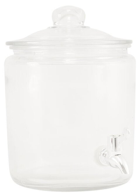 Kranen är placerad nära nederkanten av burken och är även den i glas, med en kromad finish som ger en glansig yta. Den är designad för att göra det lätt att servera drycker utan att behöva lyfta hela burken. Kranens handtag är enkelt att manövrera vilket gör påfyllning och servering smidig.