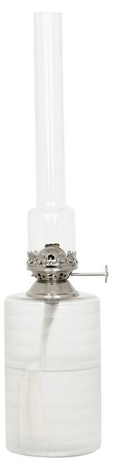 Den övre delen av lampan består av en smal, lång glasglob som sträcker sig uppåt. Glaset är klart och ljust, vilket ger ett luftigt och rent intryck. Mellan basen och glastoppen sitter en dekorativ metallring i en silveraktig färg, med intrikata utskärningar som tillför ett intressant visuellt element. På ena sidan av metallringen finns en justeringsskruv, ett praktiskt tillägg som möjliggör enkel kontroll av veken och därmed lågan.